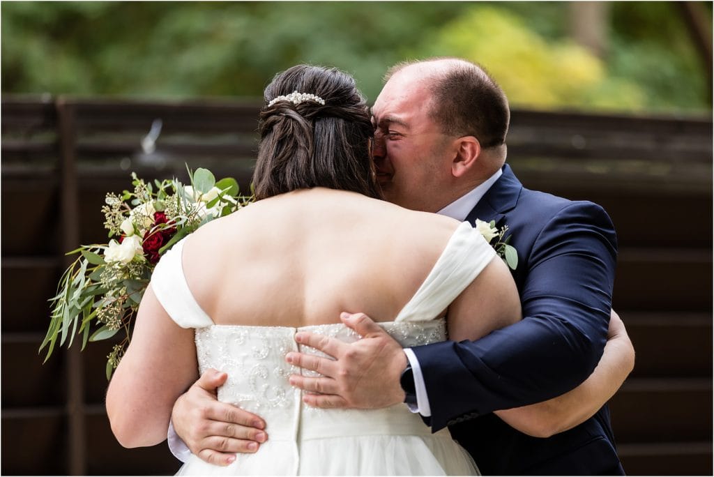 Tucked back behind the Farmhouse at People’s Light is a beautiful walking path lined with greenery that made the perfect back drop for Ashley & Nick’s first look. And what a first look it was! When brides come into our studio with a Pinterest board of first look images, they’re looking for a reaction like Nick had to Ashley! As he turned around, he welled up with tears and we heard him exclaim “I’m not sure if I should touch you,” implying she was too perfect to touch! We agree, she was an absolutely glowing bride!