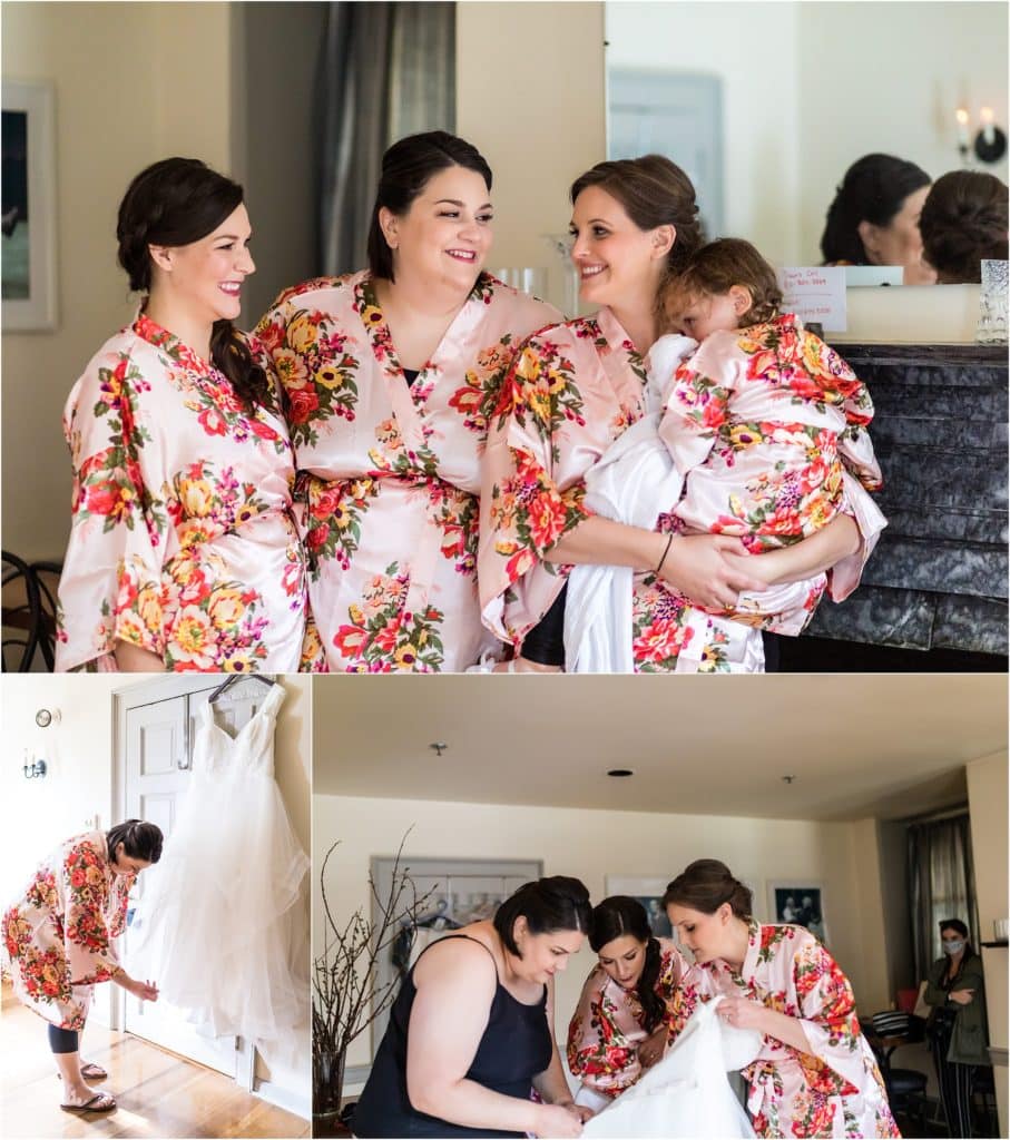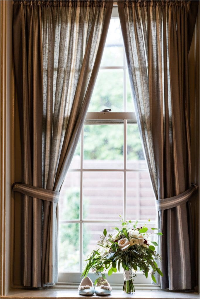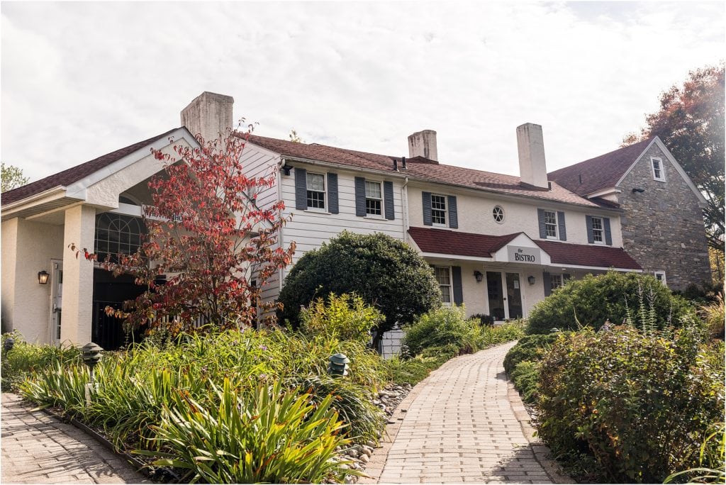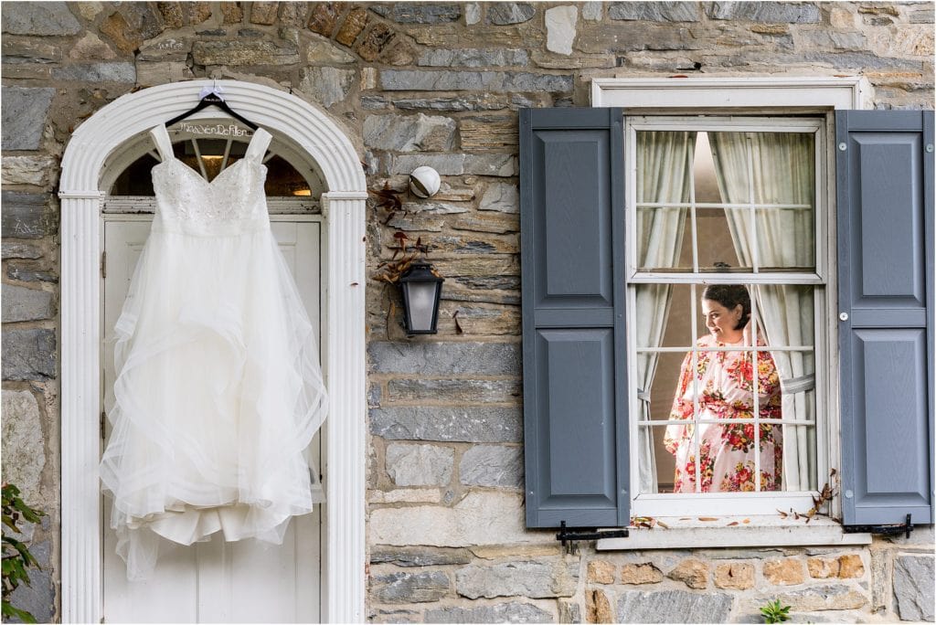 When we did arrive to the Farmhouse at People’s Light to get ready, we were greeted by her mother, two bridesmaids, and the cutest little flower girl! Everyone was relaxing with a light brunch and Ashley had her details laid out. It was the perfect set up for us to get beautiful detail portraits, while sneakily grabbing a few candids of the ladies relaxing. Before it was time to get Ashley into her dress, we popped outside to get an environmental portrait of her gown and managed to capture her in the window enjoying a quiet moment.