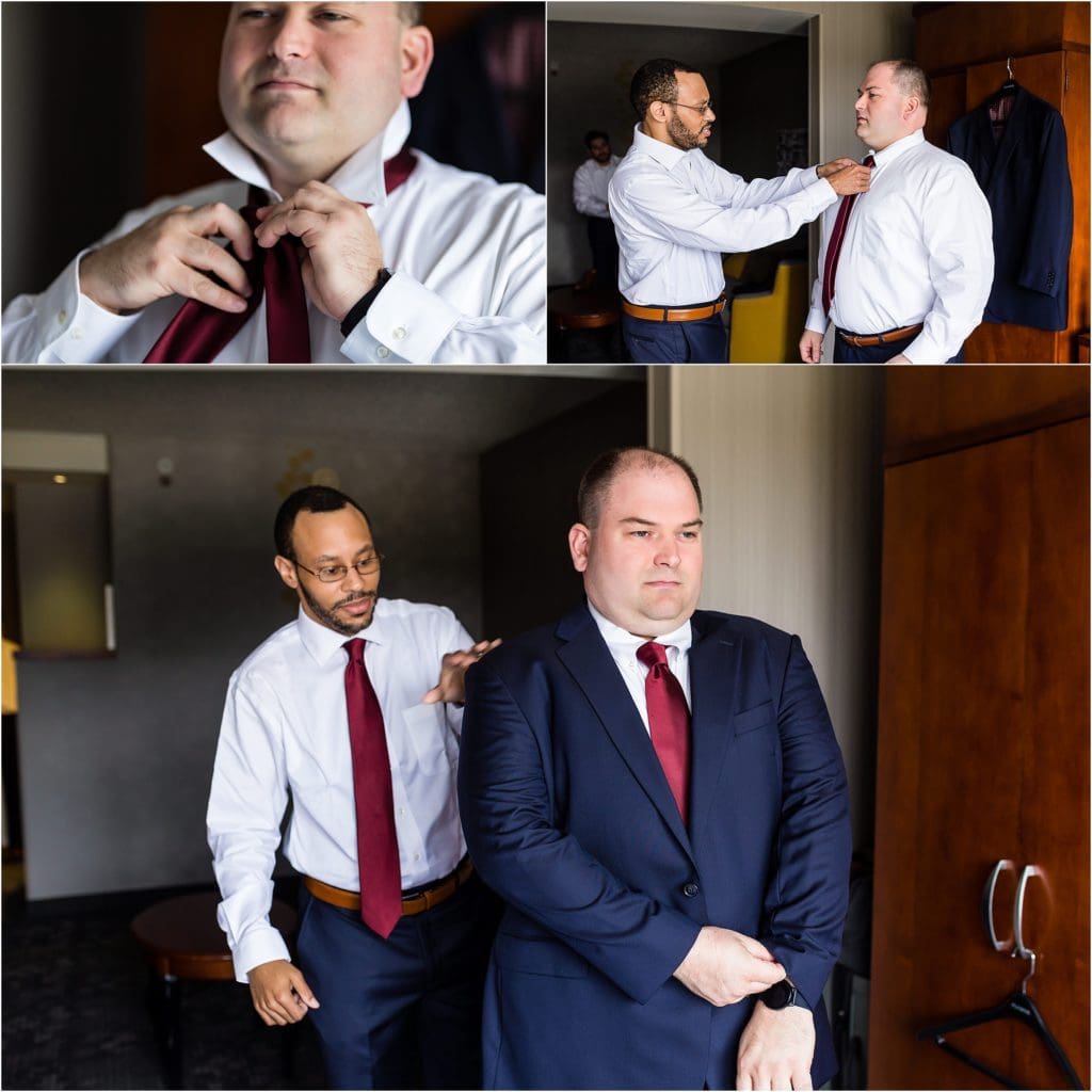 While we were busy getting Ashley together, Nick and his two groomsmen were up the road at the Courtyard Marriott – Great Valley. Rachel arrived in time to capture Nelson helping Nick with his tie and jacket before she brought the guys back to The Farmhouse at People’s Light for some pictures prior to the first look.