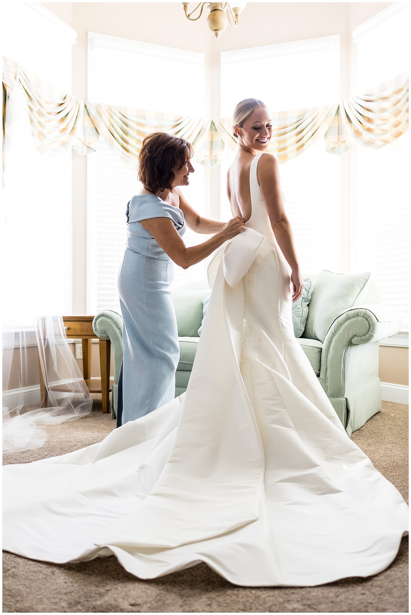 Kelly spent the morning with her family and bridesmaids in a beautiful Airbnb. Her beautiful wedding dress was hung in the window, and we were immediately drawn by the party-piece bow on the back of the dress. Kelly was so excited about it and had told us that it was her favorite part of her wedding dress. So, obviously, we photographed it as much as possible.