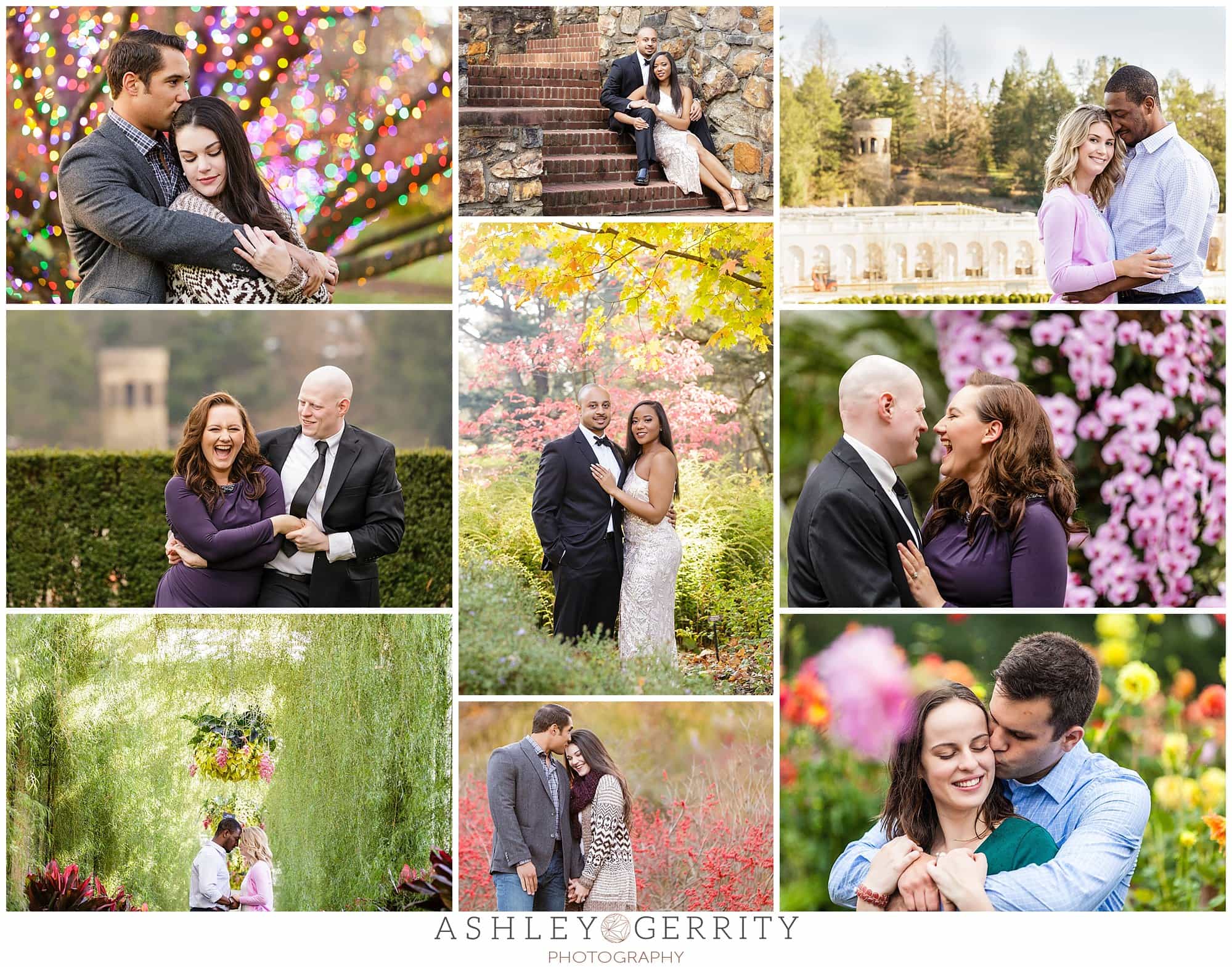 In the spring, the bright blooms burst forth and the colors inspire us to new levels of creativity. In the height of the summer, the deepest shady greens and water displays make for a refreshing engagement session despite the heat. As the weather cools and autumn makes its grand appearance, the trees begin their annual fireworks display. The long light only adds to this golden array. Even in the dead of the winter, the holiday light extravaganza twinkles and sparkles. You and your honey can snuggle for warmth and bask in the warm glow of the season.