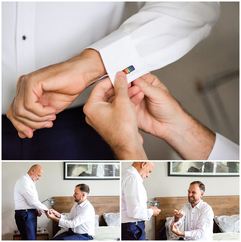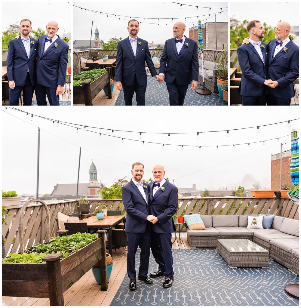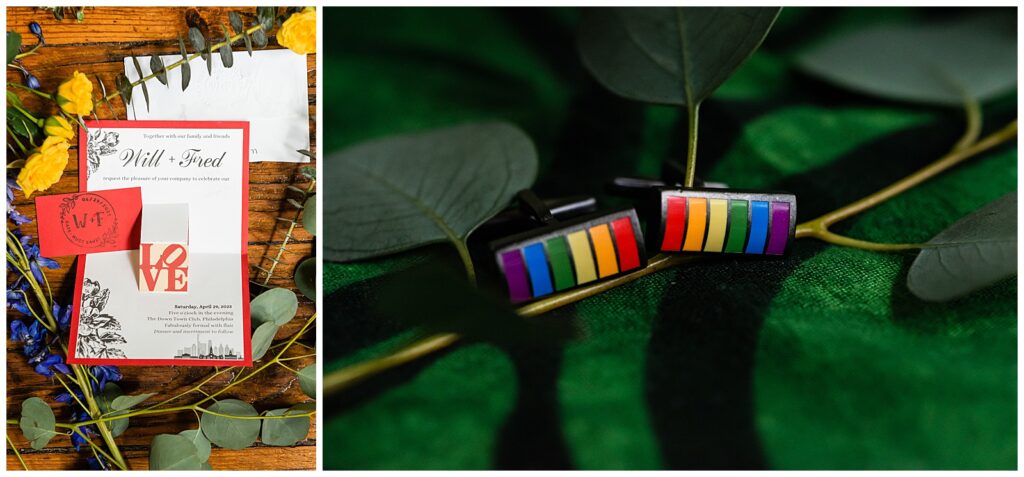 Beginning the day together in their East Passyunk place, Will & Fred began the final preparations for their Cescaphe wedding at the Down Town Club. Their precise planning and careful crafting paying off as we began arranging all their dazzling details. The phenomenal Philly LOVE themed invitation suite designed and formed by the grooms perfectly paired with their matching rainbow cufflinks. Each groom donned vests and bowties in their own shade of purple coordinating and connecting their ensembles. The pair sharing quick kisses and loving looks while helping each other straighten and secure their bowties, cufflinks, and shoes. With two gorgeous grooms ready for the day, they took to the streets of Philadelphia for portraits before their Cescaphe wedding at the Down Town Club.