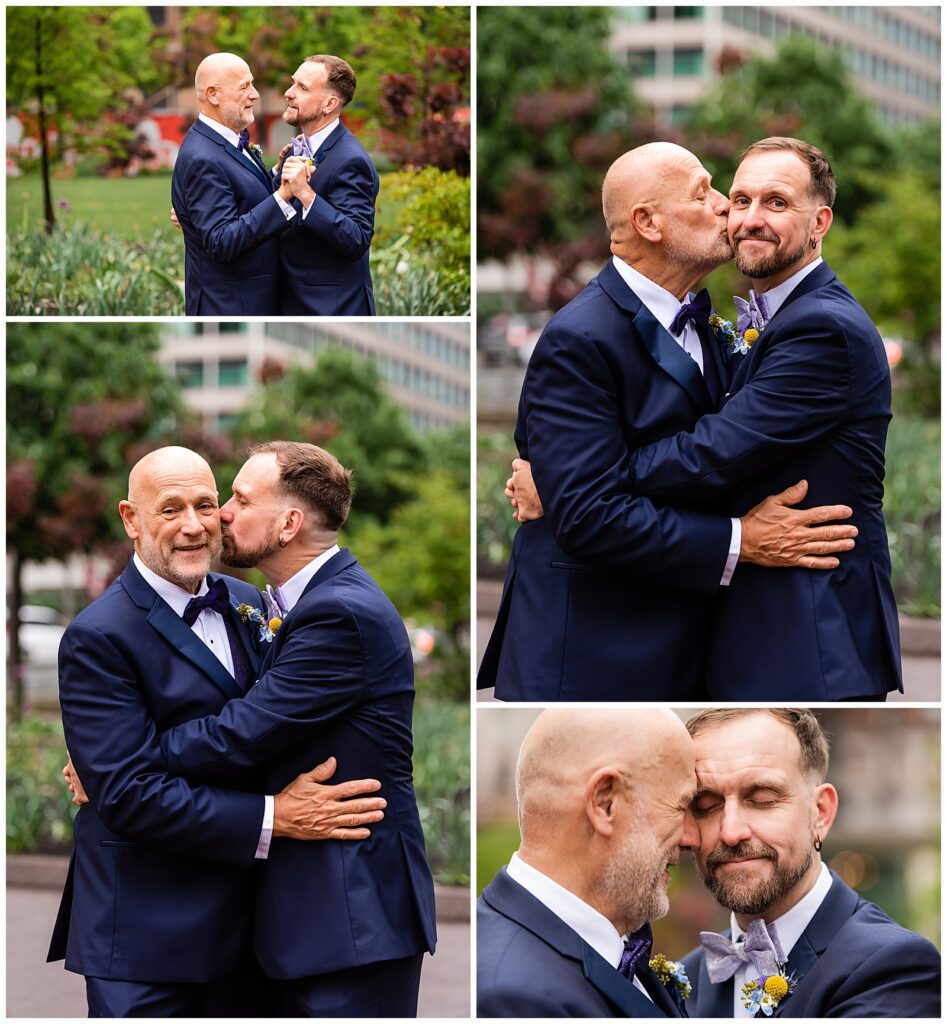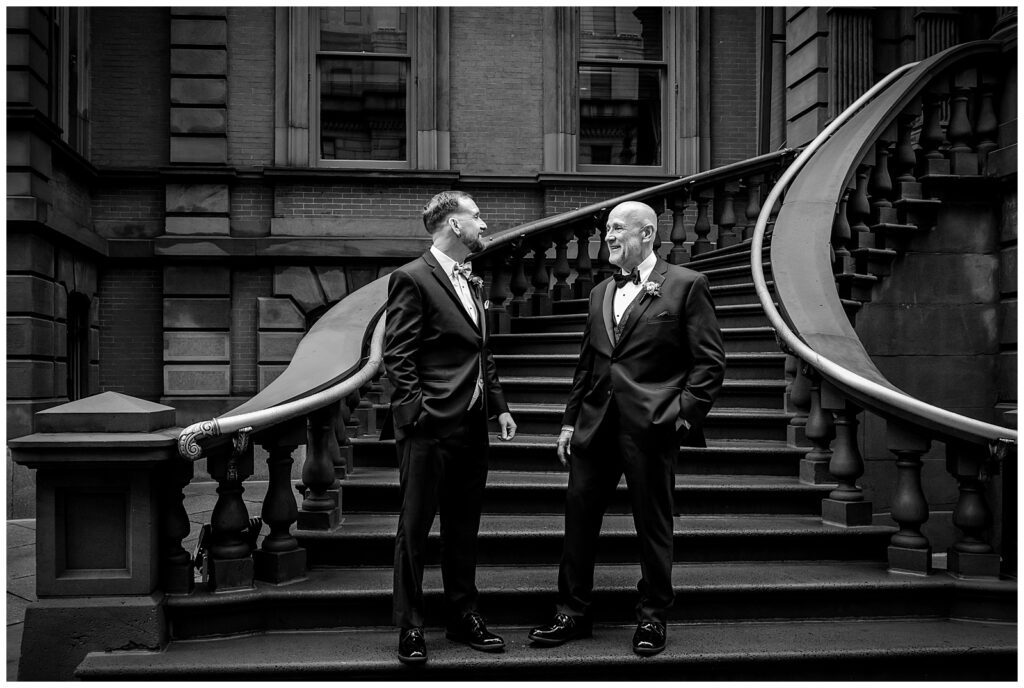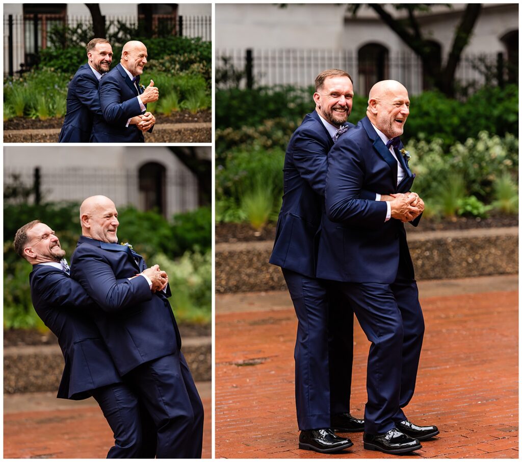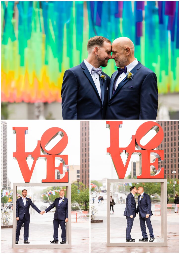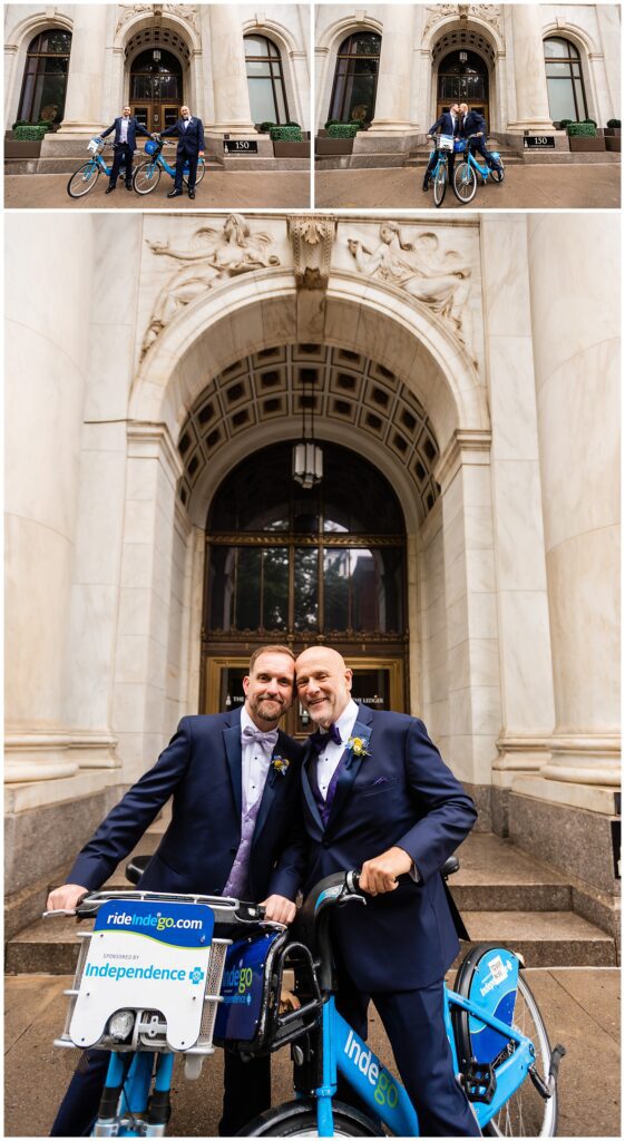 While Philadelphia is known for many things, the City of Brotherly love has a reputation for its strong sense of community. Whether it be rooting for one of the beloved sports teams or coming together for Pride, nobody loves harder than a Philadelphian. Exploring our favorite iconic locations, Will & Fred beamed joy and love throughout the city. Making stops on the steps of Union League, City Hall, and our personal favorite of the day, Love Park. The grooms snuggled on the stairs, shared a dance on Broad Street, and smooched under the iconic LOVE sculpture before renting bikes and spending a moment partaking in one of Will’s favorite activities. We love when our couples can carve out some time to really make the day their own. After a quick ride, it was finally time for the Cescaphe wedding at Down Town Club.