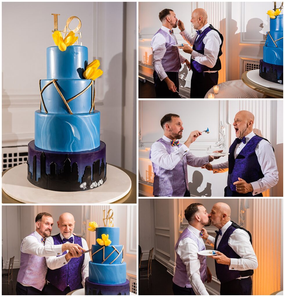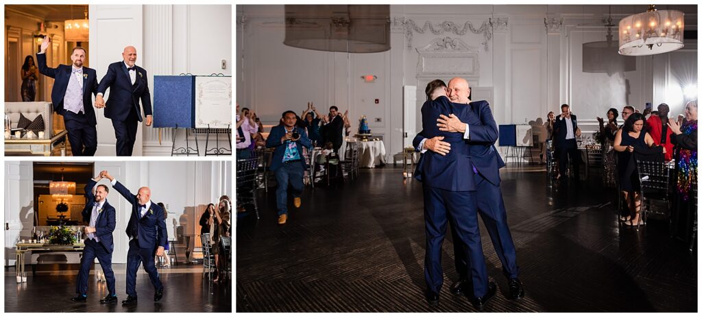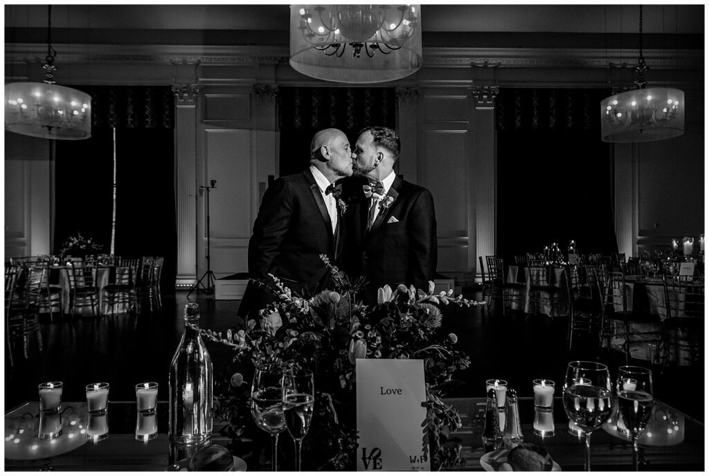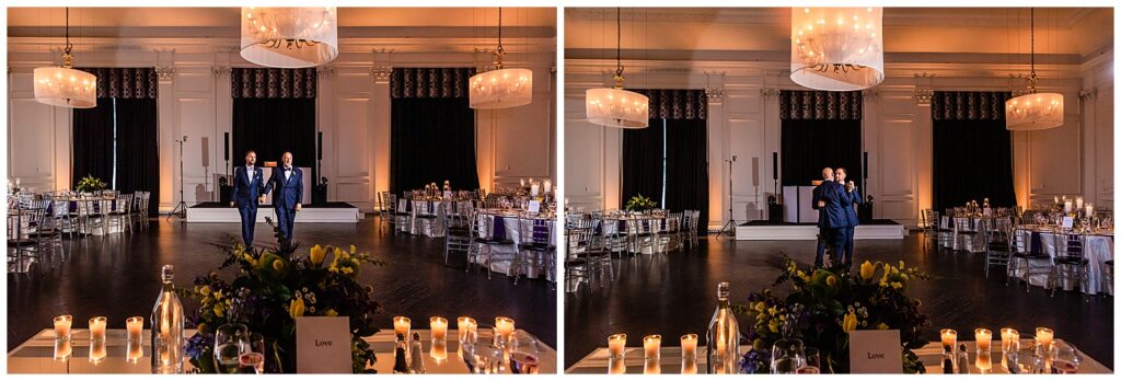 After quickly capturing a few formal family and friend photos, Will & Fred were able to enjoy the luxurious Cescaphe cocktail hour with all of their cherished guests. The grooms were so excited to gather and reunite members of their community and invited them to dress fabulously formal for their Cescaphe wedding at the Down Town Club. Meanwhile, Beautiful Blooms and the Cescaphe team splendidly set the ballroom for the celebrations ahead. The grooms were able to sneak a peek and practice their first dance in the empty ballroom before making a grand entrance in front of all the guests. The new husbands shared a fun first dance emitting joy and laughter throughout and welcomed their most prized people with a toast. Heartfelt speeches given by Will’s ex-boyfriend/best friend and Fred’s best friend of 40 years were a true testament to the grooms’ value of love and friendship.
