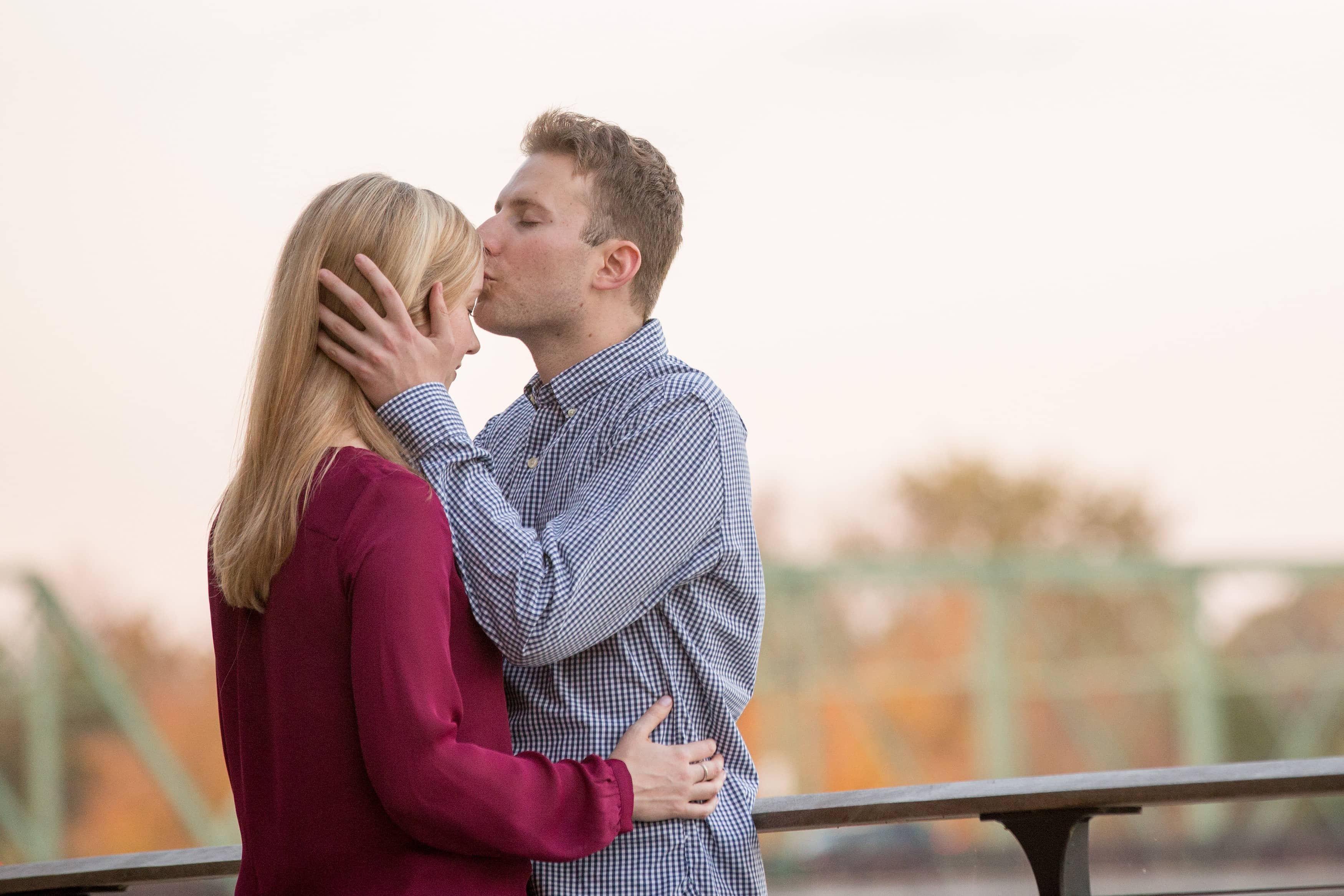 The air was cool and crisp, perfect for pulling each other close, but not too cold that they couldn’t shed their jackets for a wardrobe change. The tall grass provided seclusion for a stolen kiss, and the bridge was the right height to capture the radiant leaves of fall behind them.