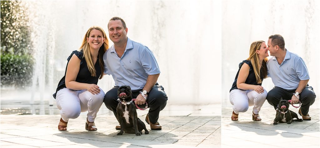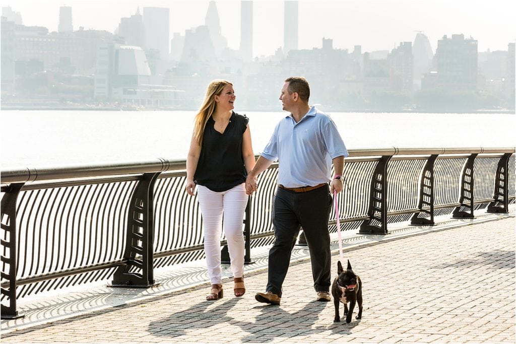 Amy and Brent and their sweet pup, Maggie, along with her parents met up with Rachel at Pier A Park. It was early. Like, 8am early. There were people everywhere, running, walking their dog, grabbing coffee on the way to work. Those people weren’t in our way though as we got started. With NYC glittering across the river, we got right to work capturing these two and Maggie.
