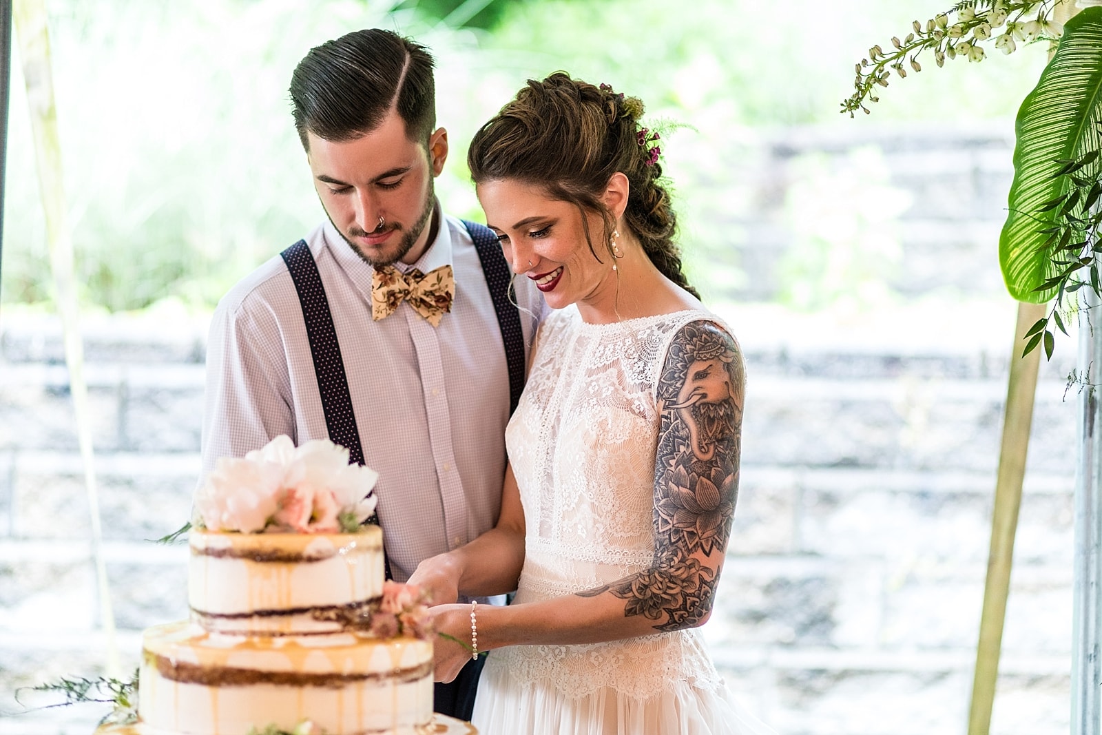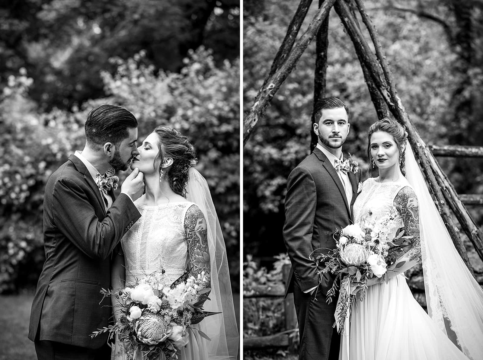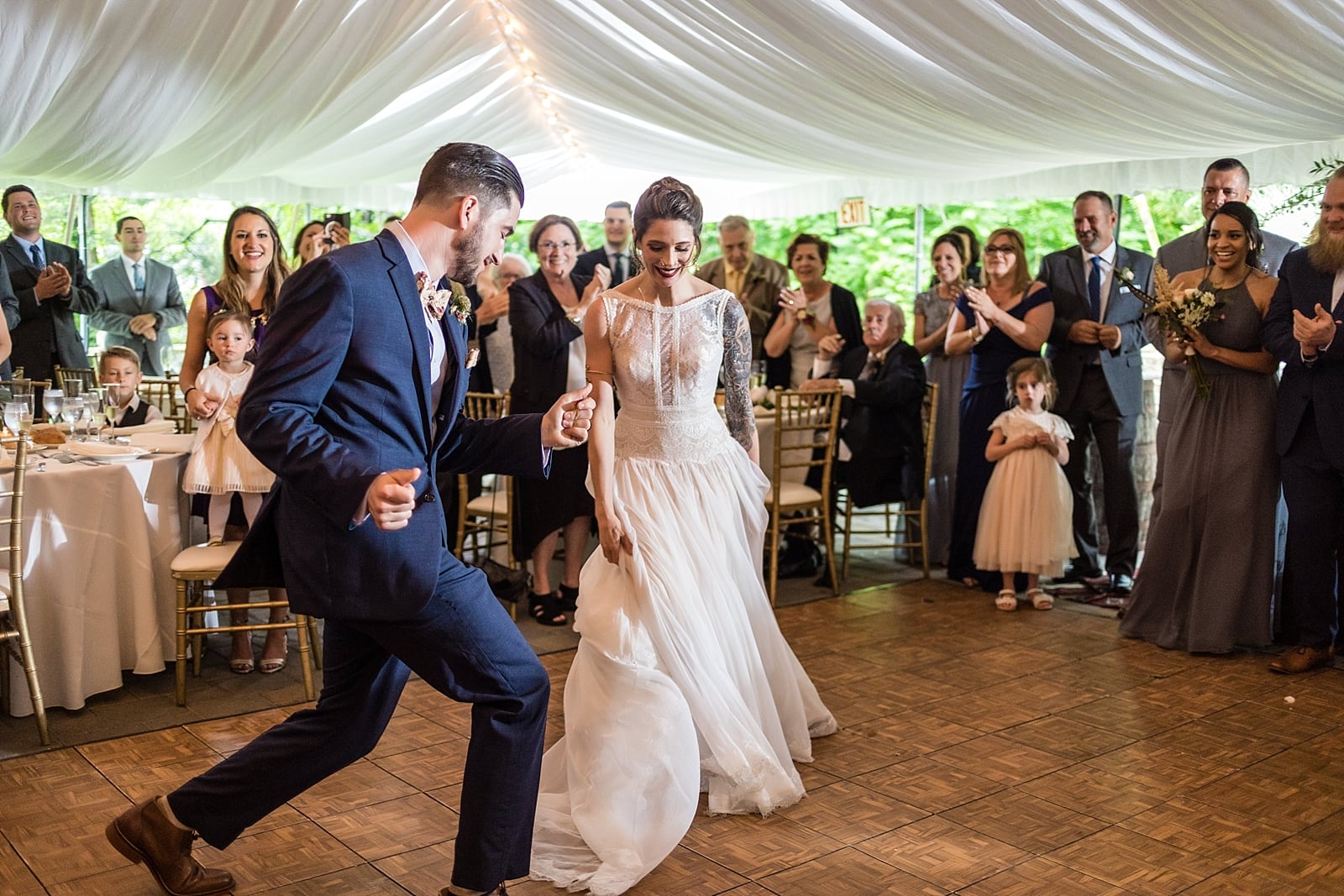 Everyone found their seats and waited for Tom and the groomsmen to enter. They crossed the wooden bridge and walked up to their spot in the tent. The bridesmaids walked the path to the ceremony in a slight drizzle of rain with smiles shining bright. Roman and Kayleigh, the ring bearer and flower girl, sprinted down the isle to meet their dad with a huge smile on his face, and await the entrance of Rachel. Rachel and her father walked down the isle and Tom could not take his misty eyes of her, the moment he had been awaiting had arrived. Joy and laughter filled the ceremony. Their handwritten vows put tears in the eyes of all the guests with just how heartfelt the sentiments were. They were pronounced husband and wife, sealed it with a kiss and the guests ruptured with excitement.