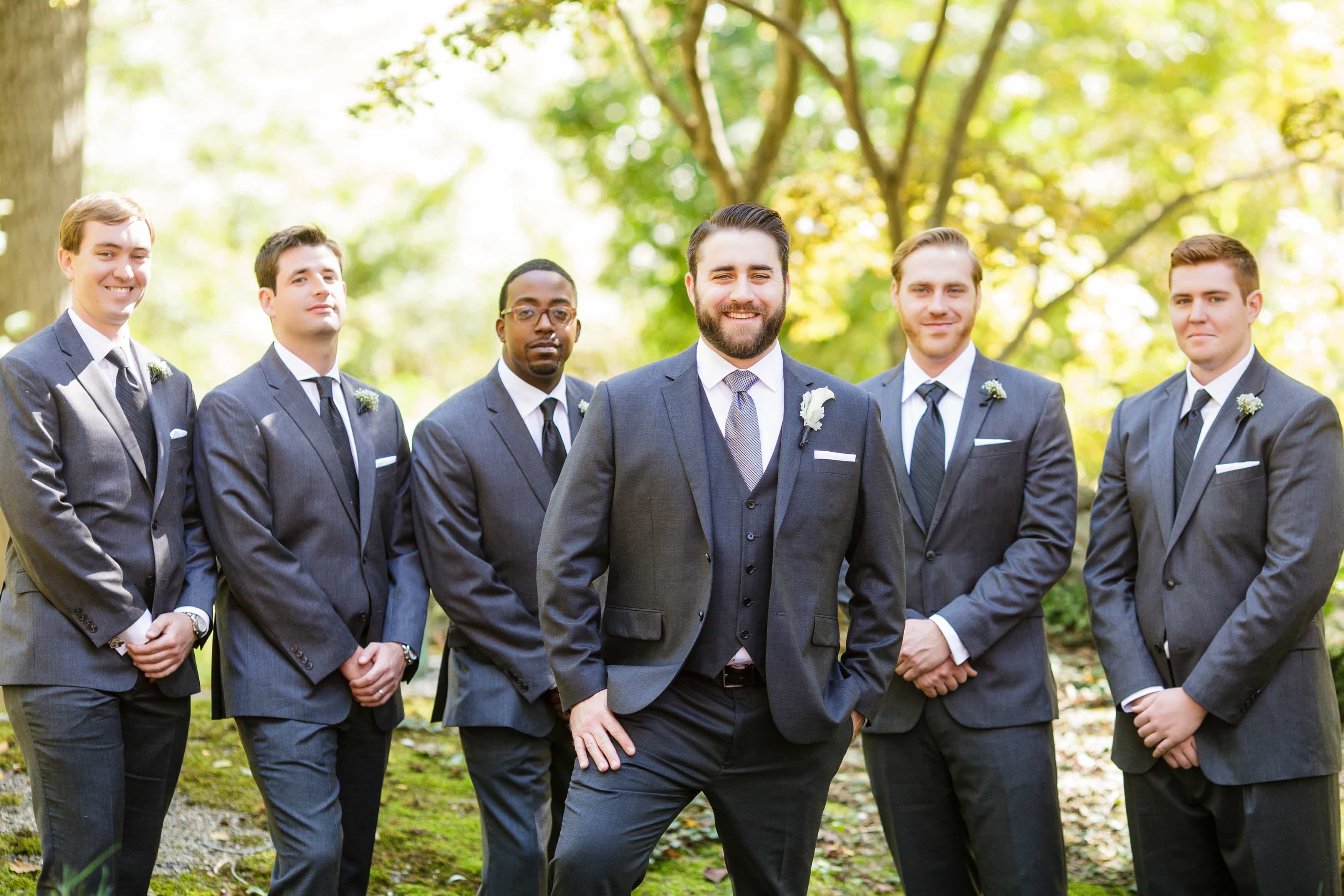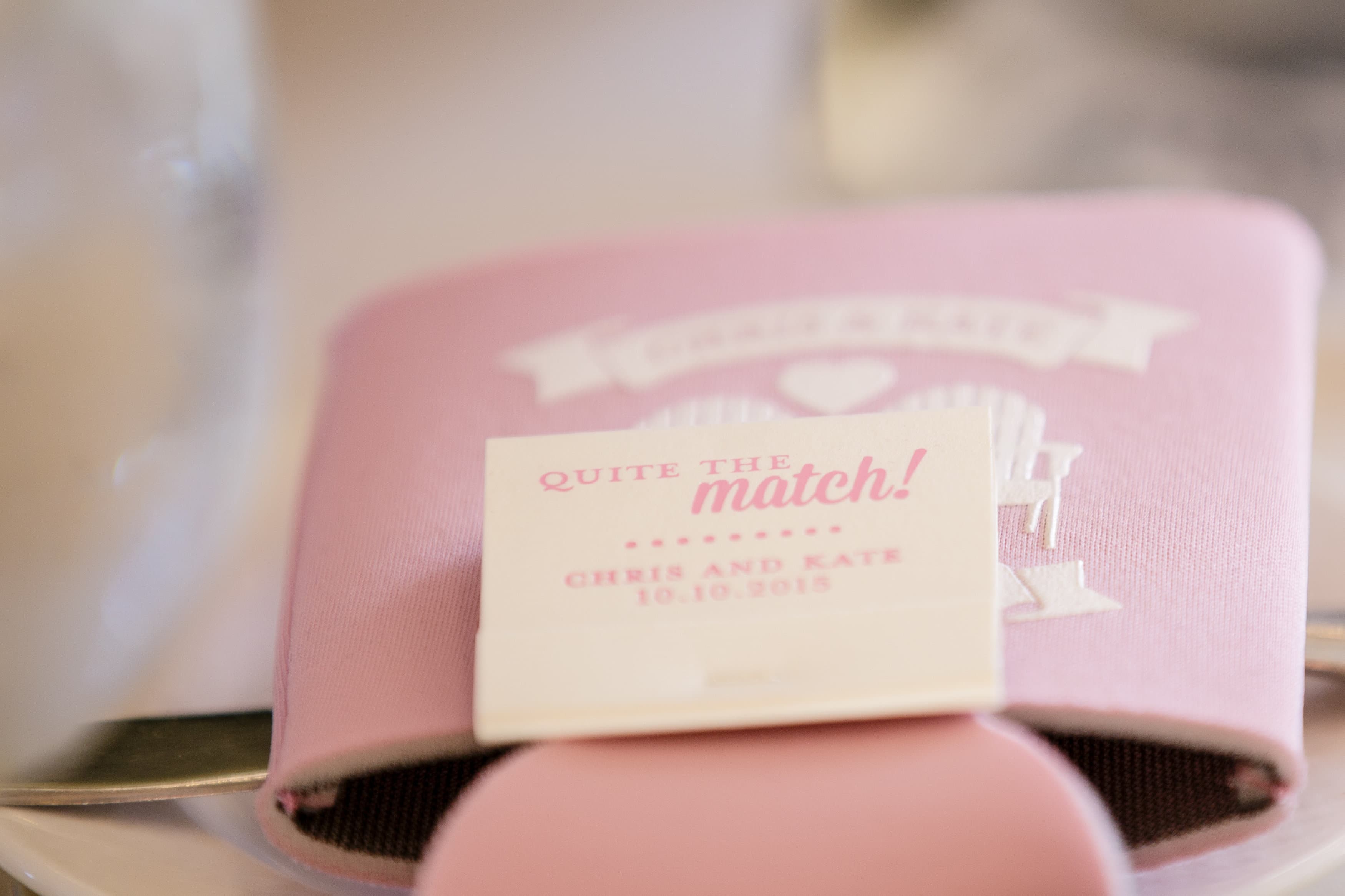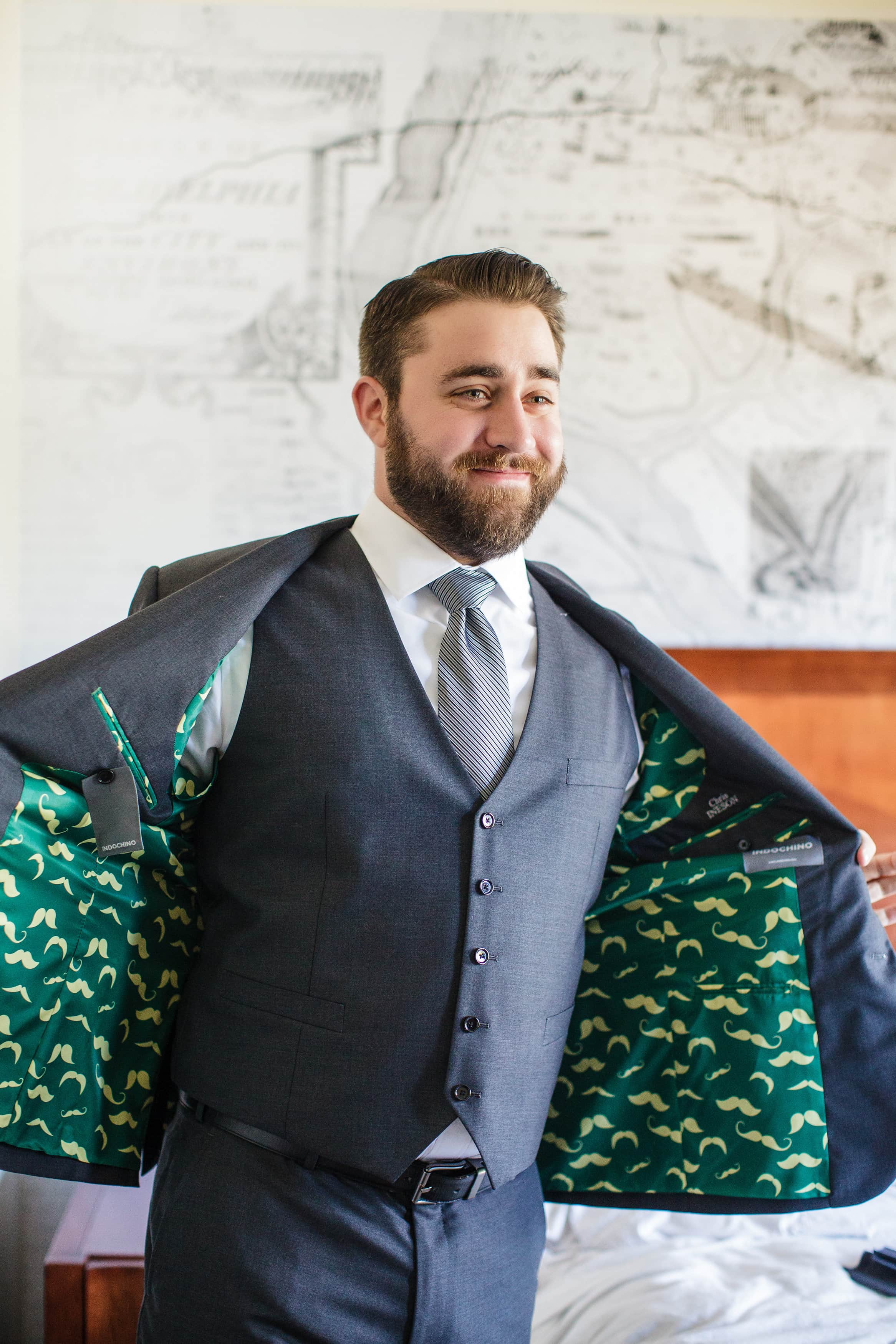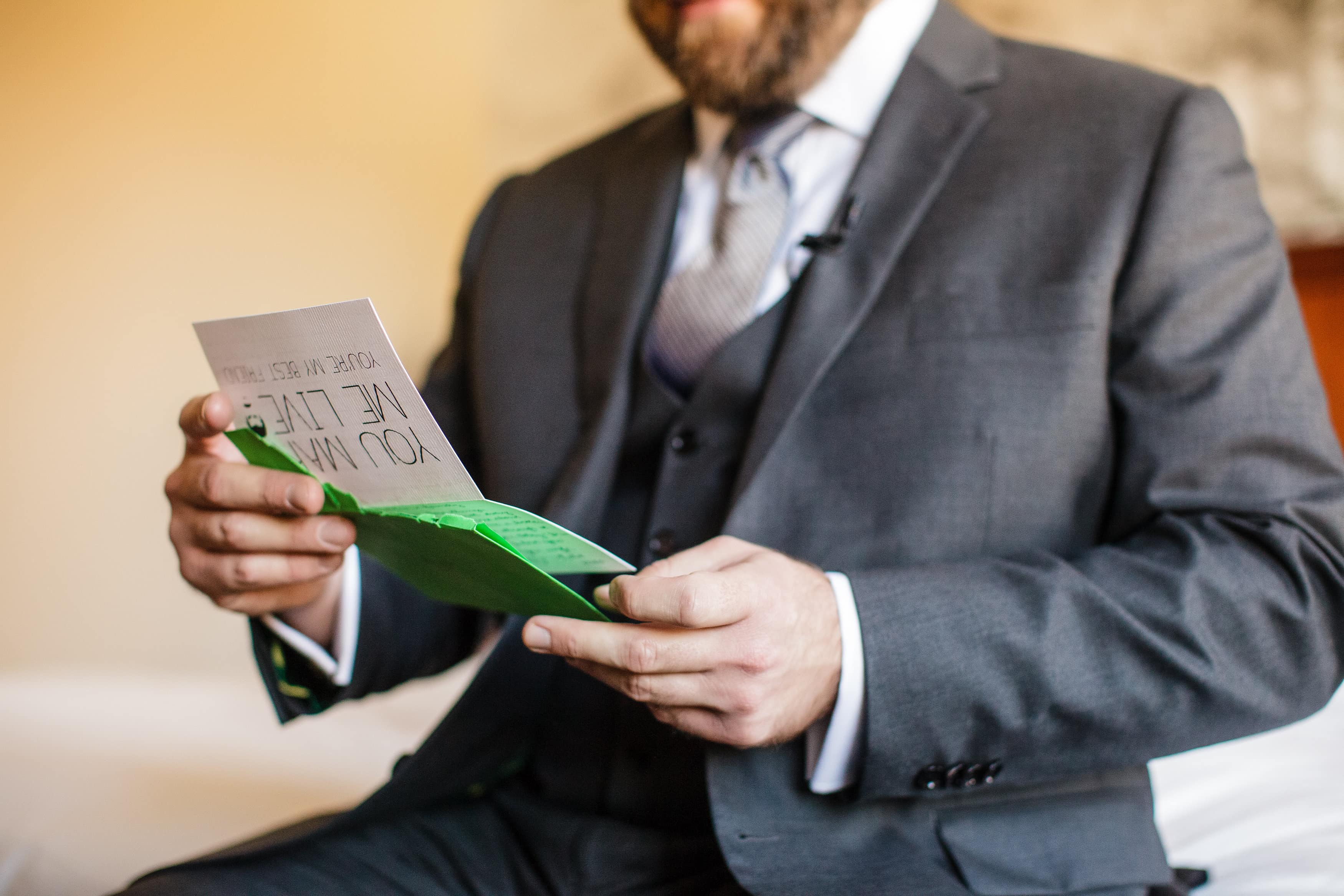 In the meantime, Chris and his groomsmen were having a great time getting ready. Chris was almost giddy as he put on his tie and his amazing mustachioed suit jacket. His handcrafted six pack holders that he had made for his groomsmen sat on the desk, filled with the necessities for the day: Jameson, Yuengling, and a pair of socks. Each groomsmen had a pair of gifted cufflinks that encapsulated his relationship with them. The hammer of Thor, poker hands, and the state of Maryland flag to name a few. Once he was dressed, a letter arrived. He beamed as he read the words Kate had written and with great vigor led the charge to the limo to get to the church for the first look.