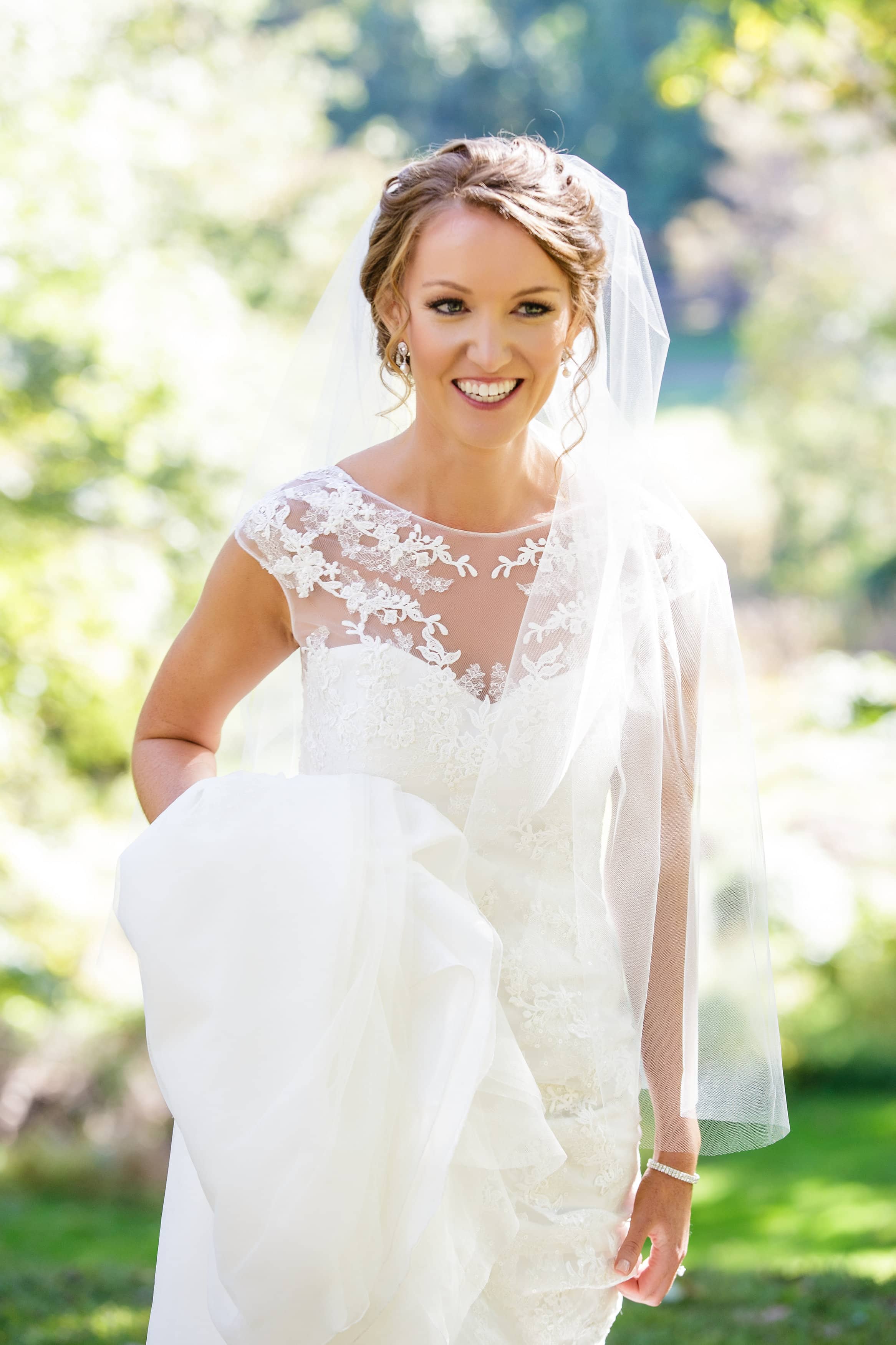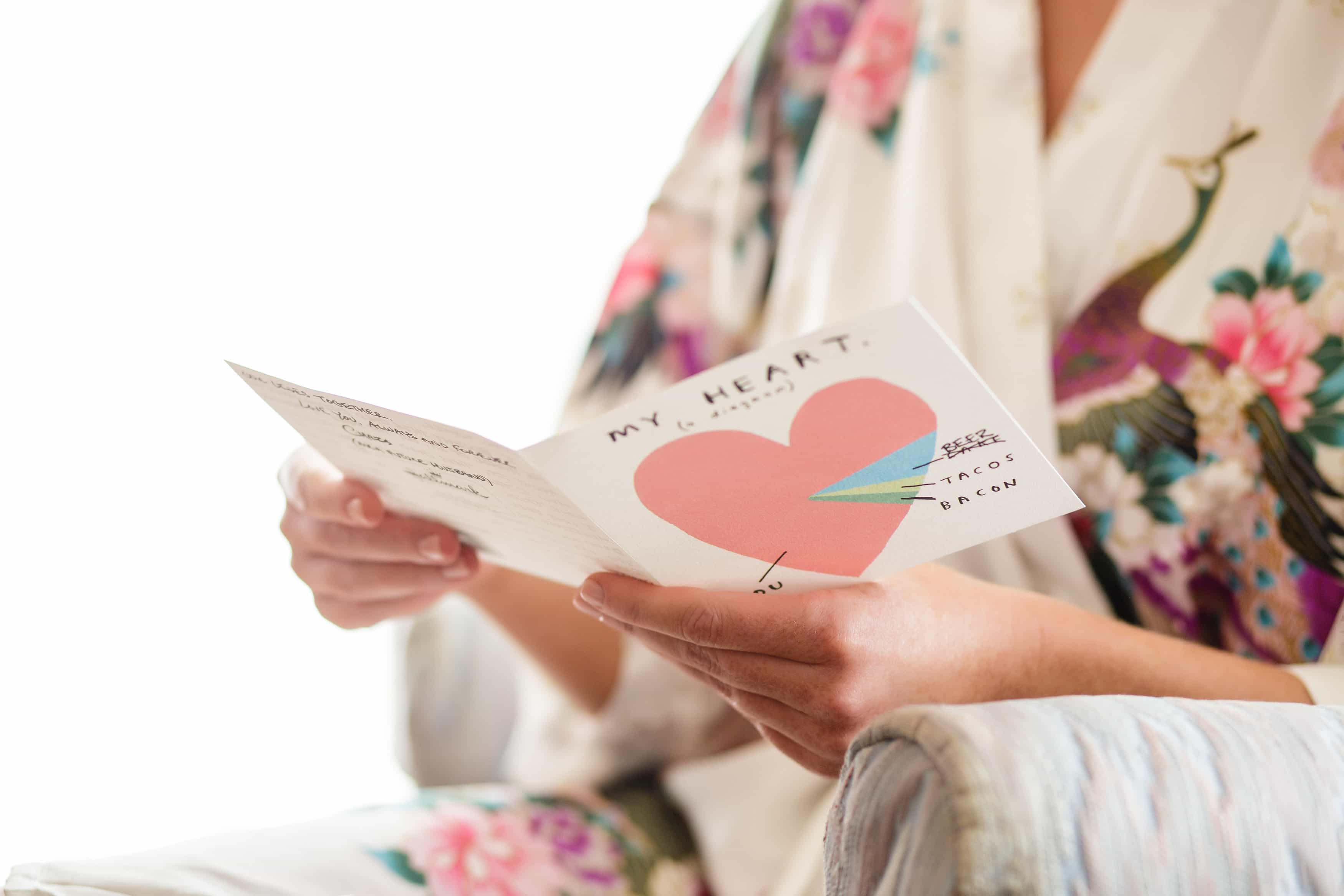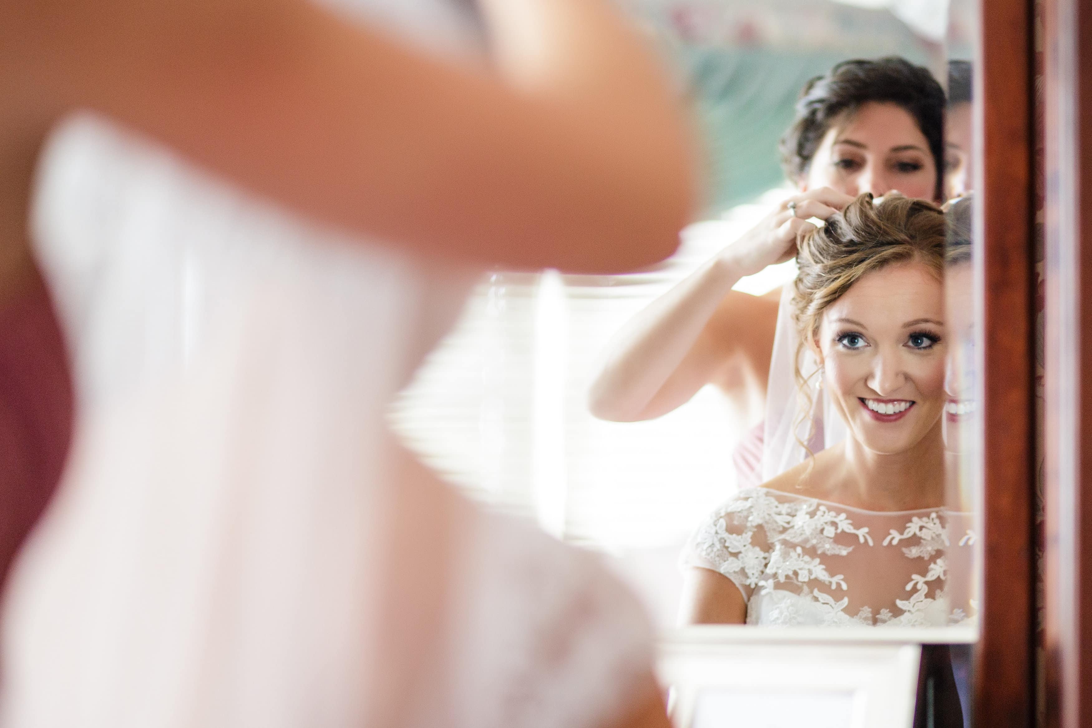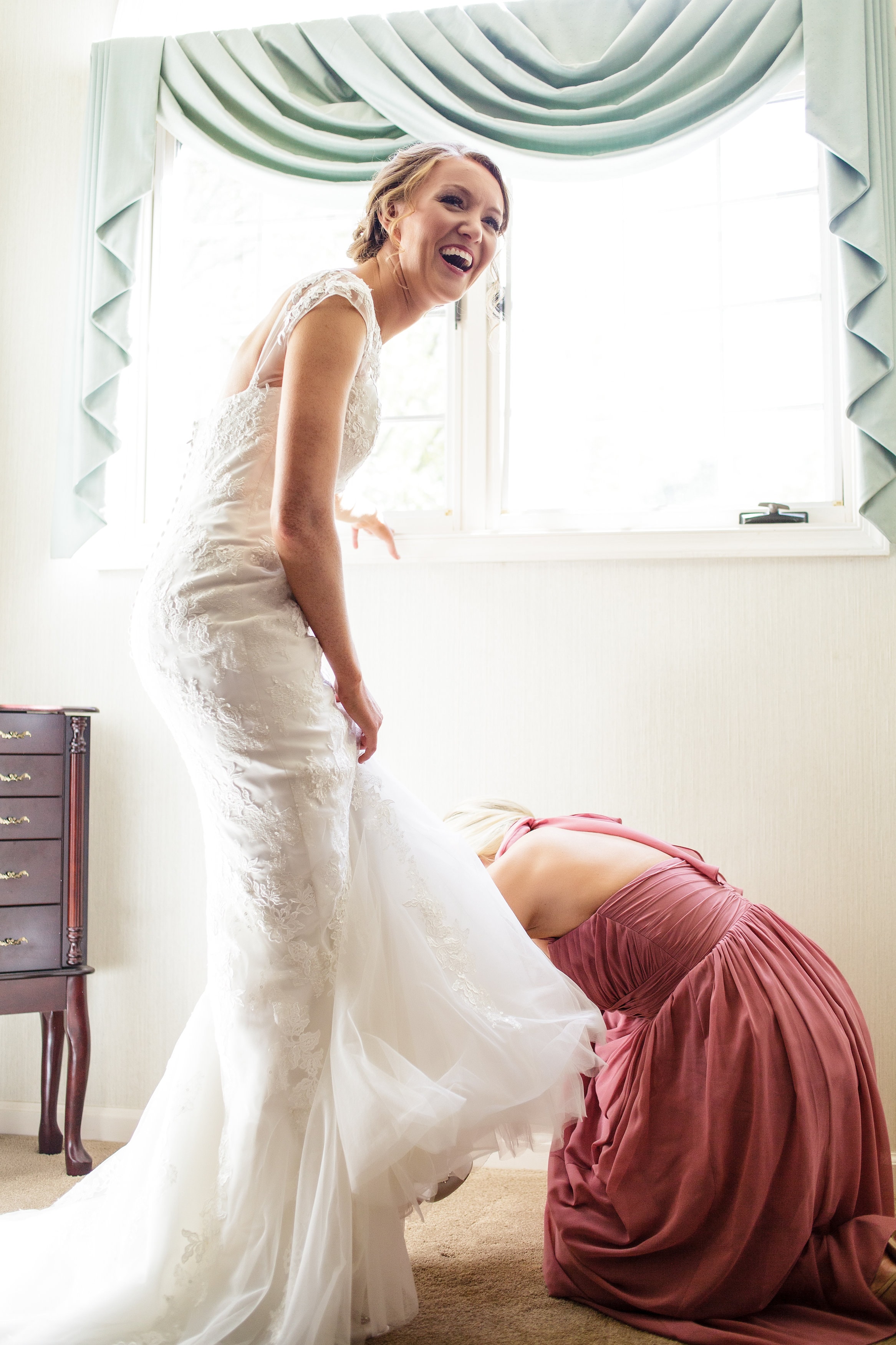 Kate and Chris’s wedding will not be soon forgotten by us. The scene was set on a beautifully warm Saturday in early October. We arrived to find Kate and her bridesmaids getting ready in matching robes, laughing together and enjoying the morning. Her white and sparkly Badgley Mischka heels and her beautiful jewelry glittered in the sunlight that flooded through the huge windows. As her hair and makeup wrapped up, a special note arrived from her almost husband. Beneath the humorous cover, the letter spoke of a true and deep lifelong love that would take it’s next step that day. Kate’s eyes sparkled as she read the words Chris had penned. With her fiancés words fresh in her mind, she stepped into her dress and put on the final touches. Veil in place, shoes on her feet, and earrings affixed, she was ready to dash off to her first look.