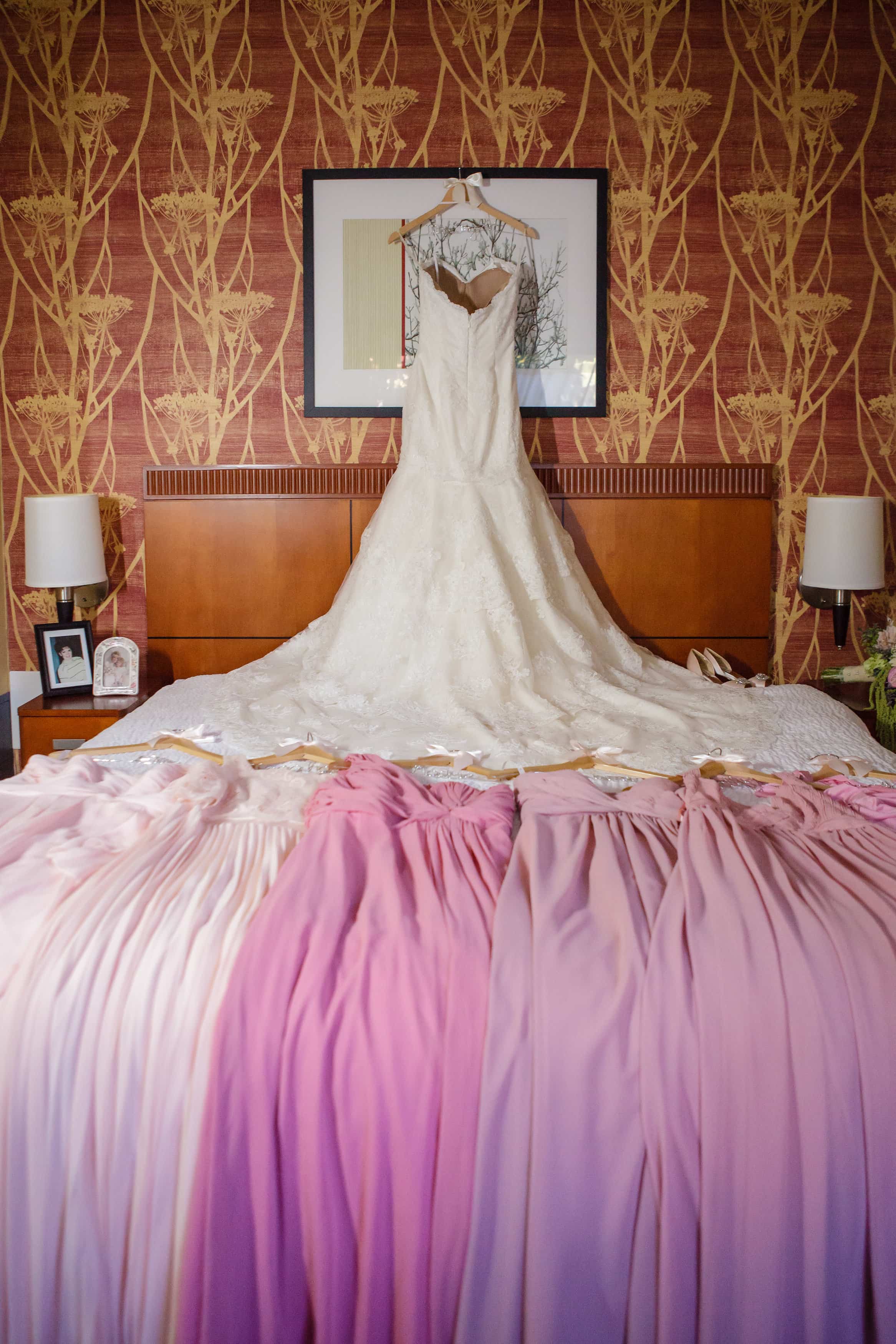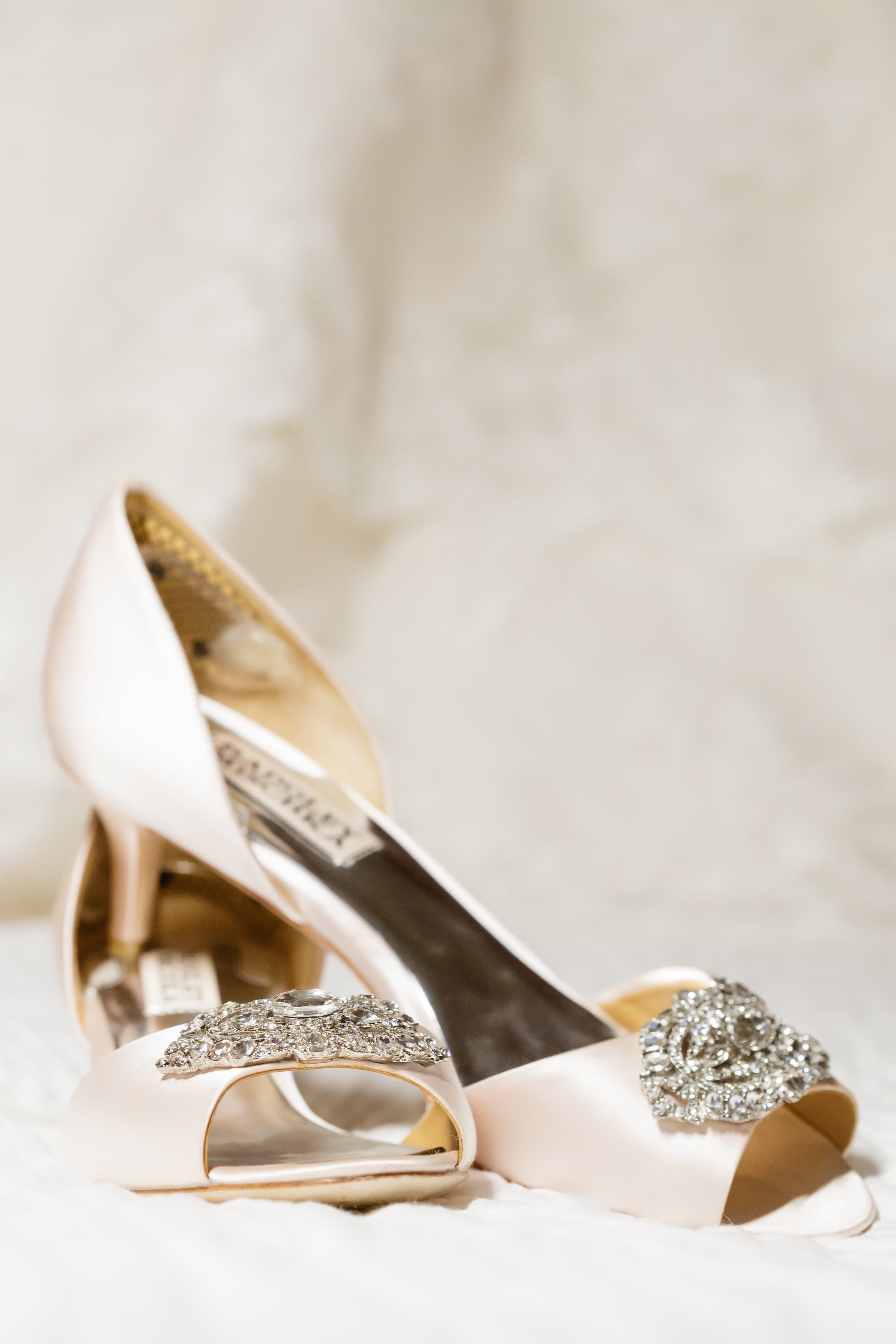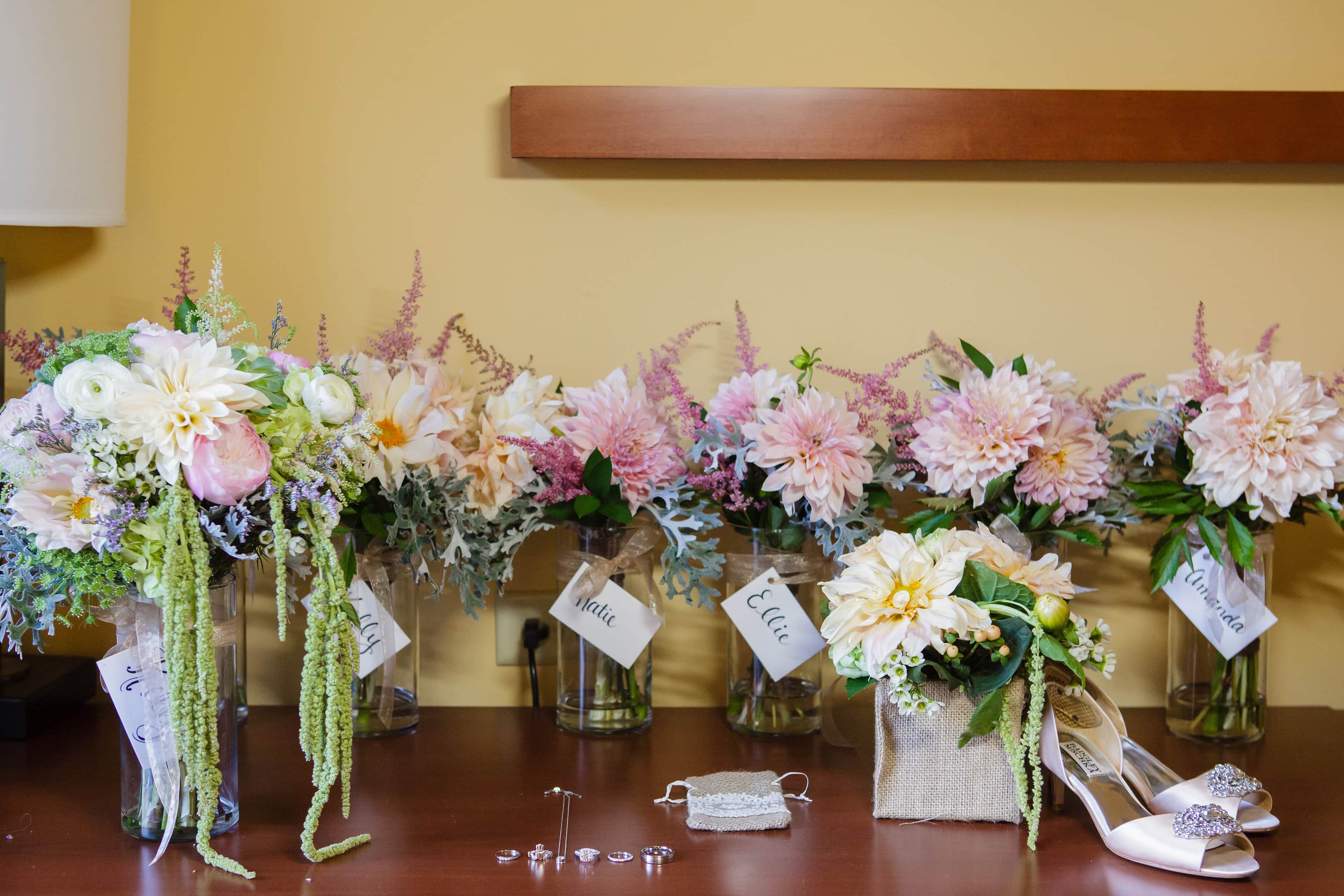 The unusually warm weather had continued late into the month, and it was a wonderful day with abundant sunshine when we arrived to photograph Kelly and Shawn as they got ready for their wedding. Kelly and her bridesmaids were all full of joy and nervous energy as they got hair and makeup done. Their beautiful blush pink dresses draped across the bed while Kelly’s JLM Couture gown designed by Lazaro hung over them were each unique to their bridesmaid. Her jewelry was laid out and her peachy pink Badgley Mischka shoes sparkled on the dresser. A little blue bow tied on the underside of her gown served as her something blue. The stunning bouquets stood in vases, awaiting the ladies who would carry them down the aisle. With a deep sigh of anticipation, Kelly stepped into her dress and her maid of honor zipped her up and tied the beautiful accent belt around her waist. The time had come, it was time to walk down the aisle and Kelly absolutely could not wait.