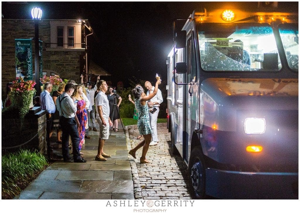 Once we all made it to safety and I quickly changed out of my waterlogged dress and shoes, the storms ended and we wandered over to the Fern house for another set of couple’s portraits before heading over to the tented area beside the Morris Arboretum welcome center for Jordan & Pete’s reception. The details & decor were all handmade by Jordan and her wedding party. Their sign in book was a leather bound bible where guests could highlight and share thoughts on meaningful verses. Jordan’s sister made all of their cake pops (and they were delicious)! And Jordan’s mom hired Mister Softee to bring cones of joy to all of the guests (and, yes, to the happy wedding photography team, too)!