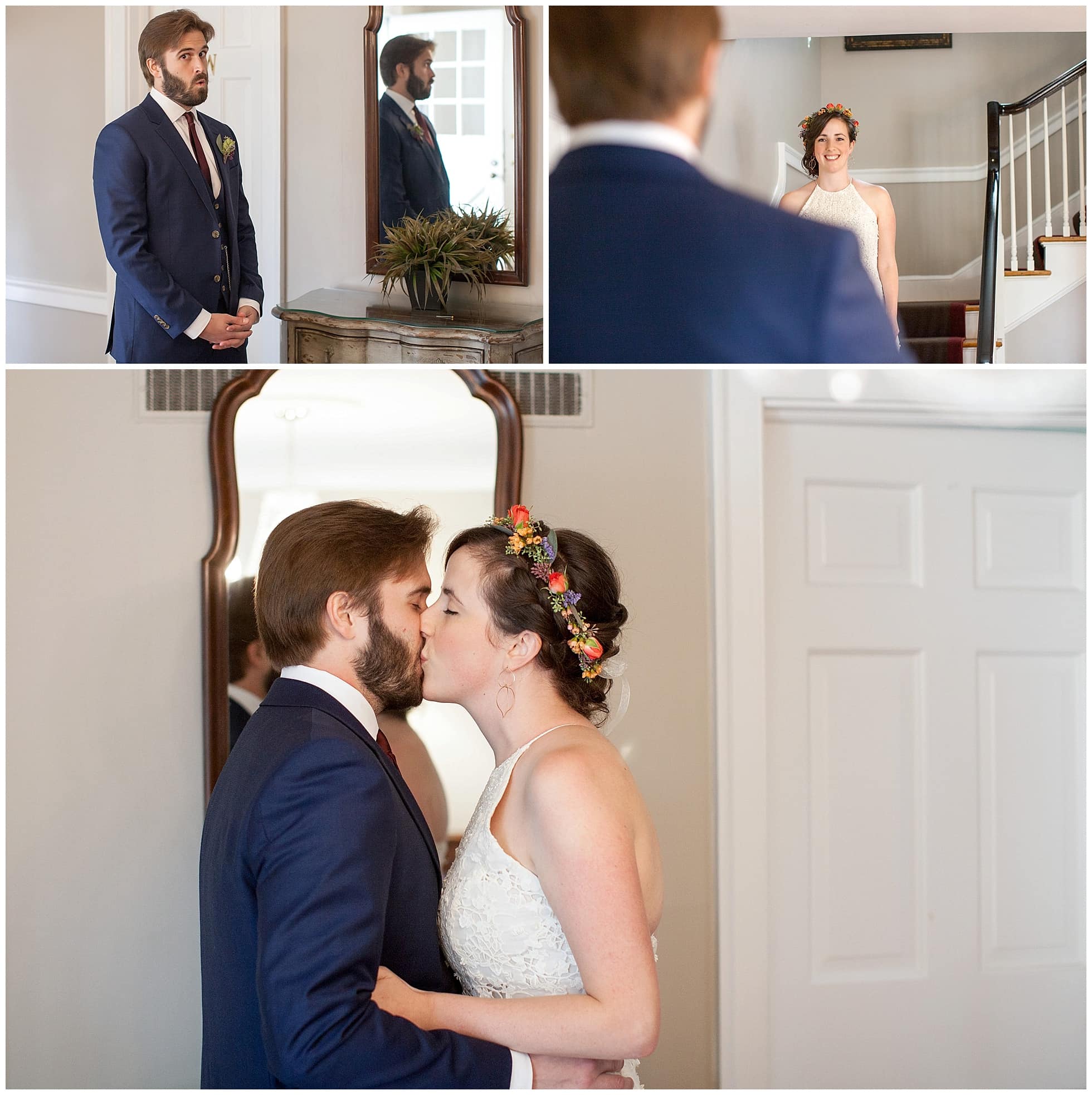 Meanwhile, Shea was getting increasingly nervous even though he was all dressed and ready to go. His friends did their best, but ultimately it took a little help from Mr. Scotch to help calm the anxious man. He just needed to see Cara. With his wonderful blue suit and wine tie in place, we placed him at the bottom of the stairs and asked Cara to come see him.
