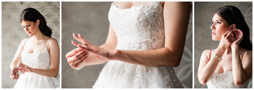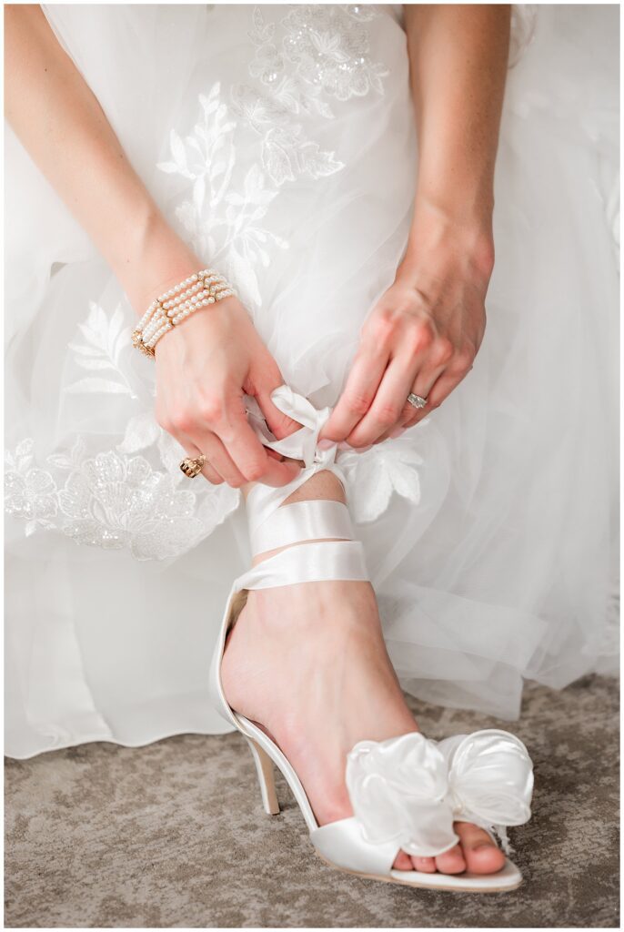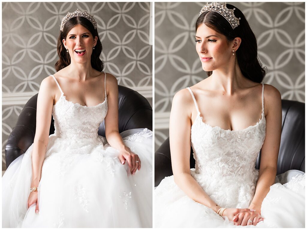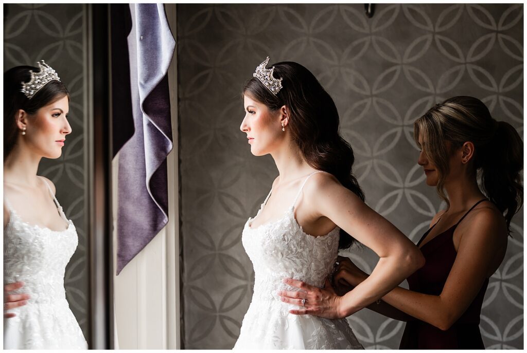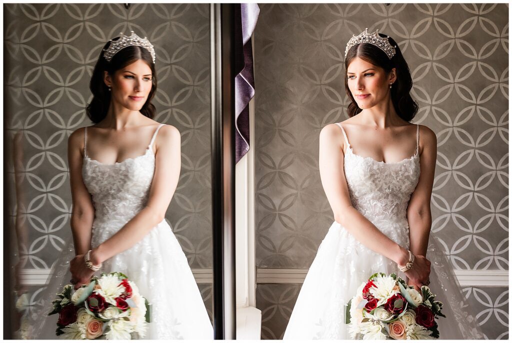 After the morning of prep at her parents house, Olivia and her group of girls arrived just about ready for the wedding day at Pen Ryn Estate. Already a picture of luxury with her hair and makeup delicately done and dressed in her a-line gown. Olivia popped into the bridal suite at the estate to add the finishing bridal touches. Once her elegant emerald engagement ring, stunningly adorned tiara, and lace-up bowtie heels were donned, we captured her bridal beauty as she posed in the window lit bridal suite.