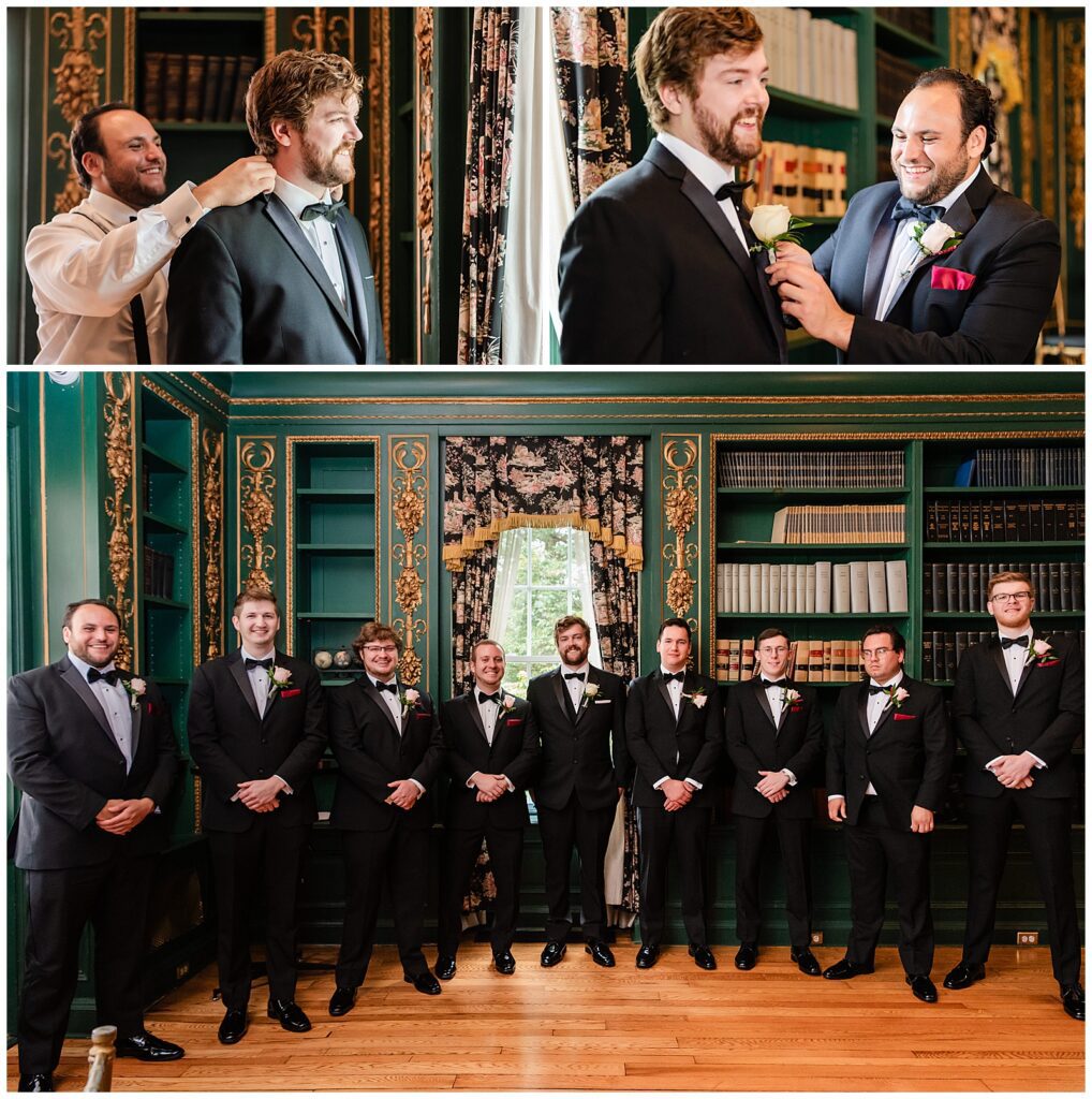Meanwhile, Nicholas awaited his bride in the lavish library room of Pen Ryn Estate. His best man added the finishing touch with a simple white rose boutonniere. Dressed in a classic black tuxedo with a vest and bowtie, Nicholas was a grand groom finally ready for his wedding at Pen Ryn.