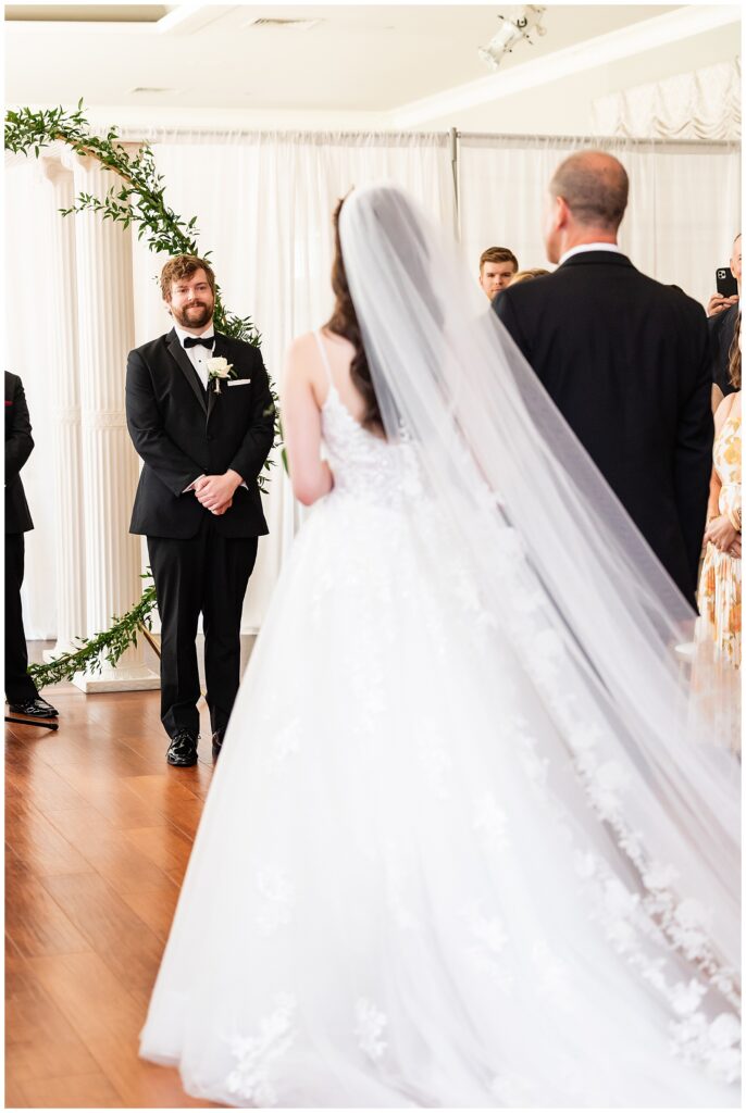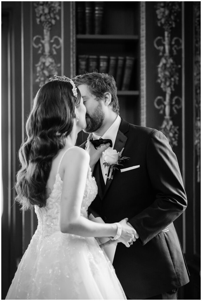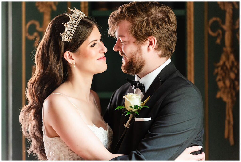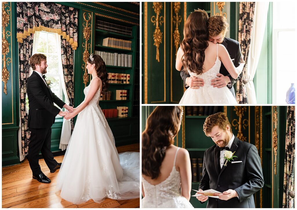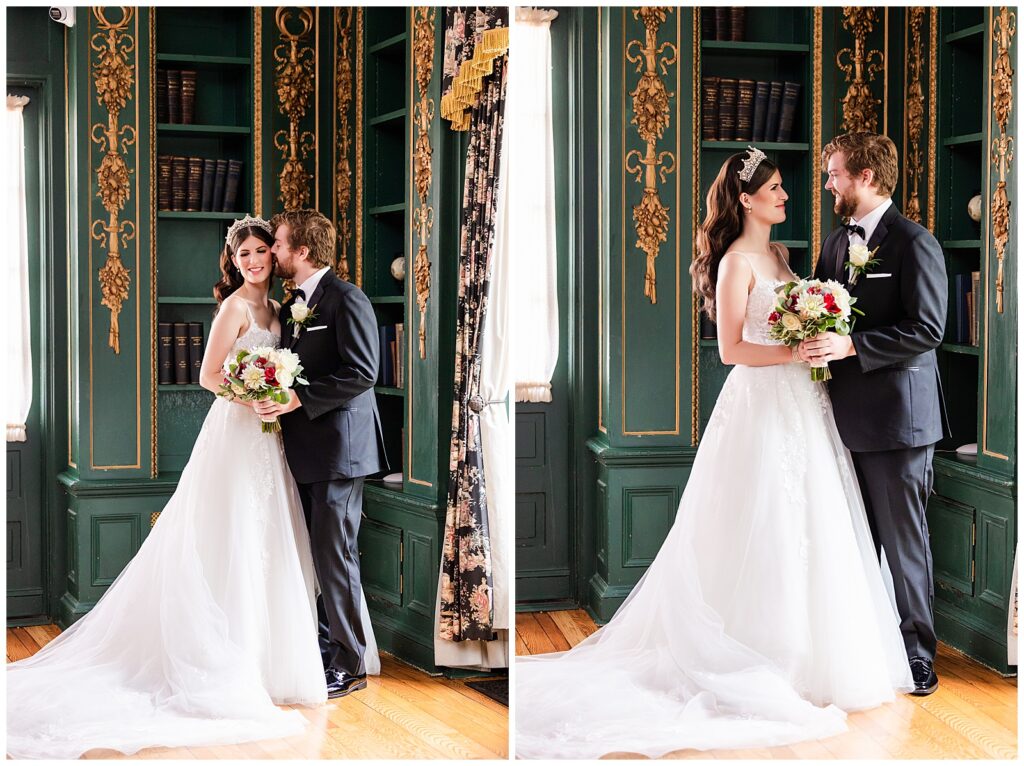 Crafted and carved with delicate detail, the ornate library room was the perfect statement spot for Olivia & Nicholas’ first look. With Nicholas in position, Olivia opened the doors and walked through the room to finally tap him on the shoulder. After spinning around, his jaw dropped at the sight of his bride in her graceful gown and garb. We couldn’t resist snapping a few classic portraits surrounded by the gorgeous green and gold accents before taking to the grounds of the estate.