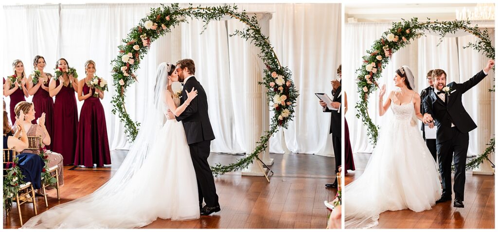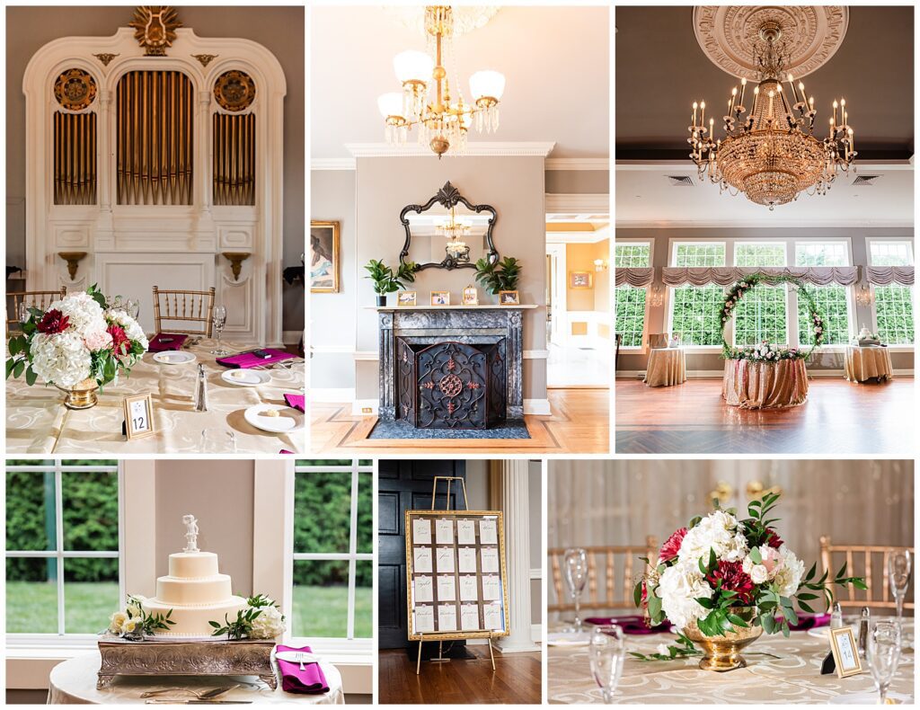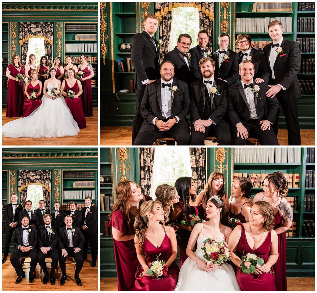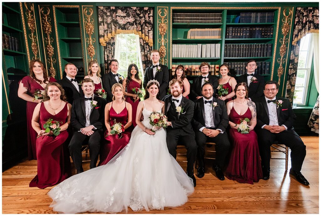 Back in the luxurious library, friends and family gathered around for their formal photos with the bride and groom. The ravishing room and boasting bookshelves paired perfectly with the sizable wedding party and set the stage for those epic group photos. Olivia’s bridesmaids dressed in the perfect complimenting shade of red against the contrasting green walls, the crispy black tuxedos on the groomsmen, and the layers of friends. It was the perfect recipe for creating a cool & classic portrait. Finally, the time to get Olivia & Nicholas married in a ballroom wedding ceremony at Pen Ryn Estate had come!