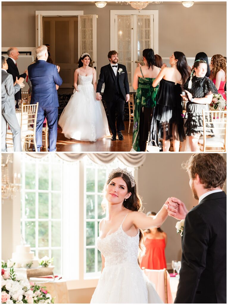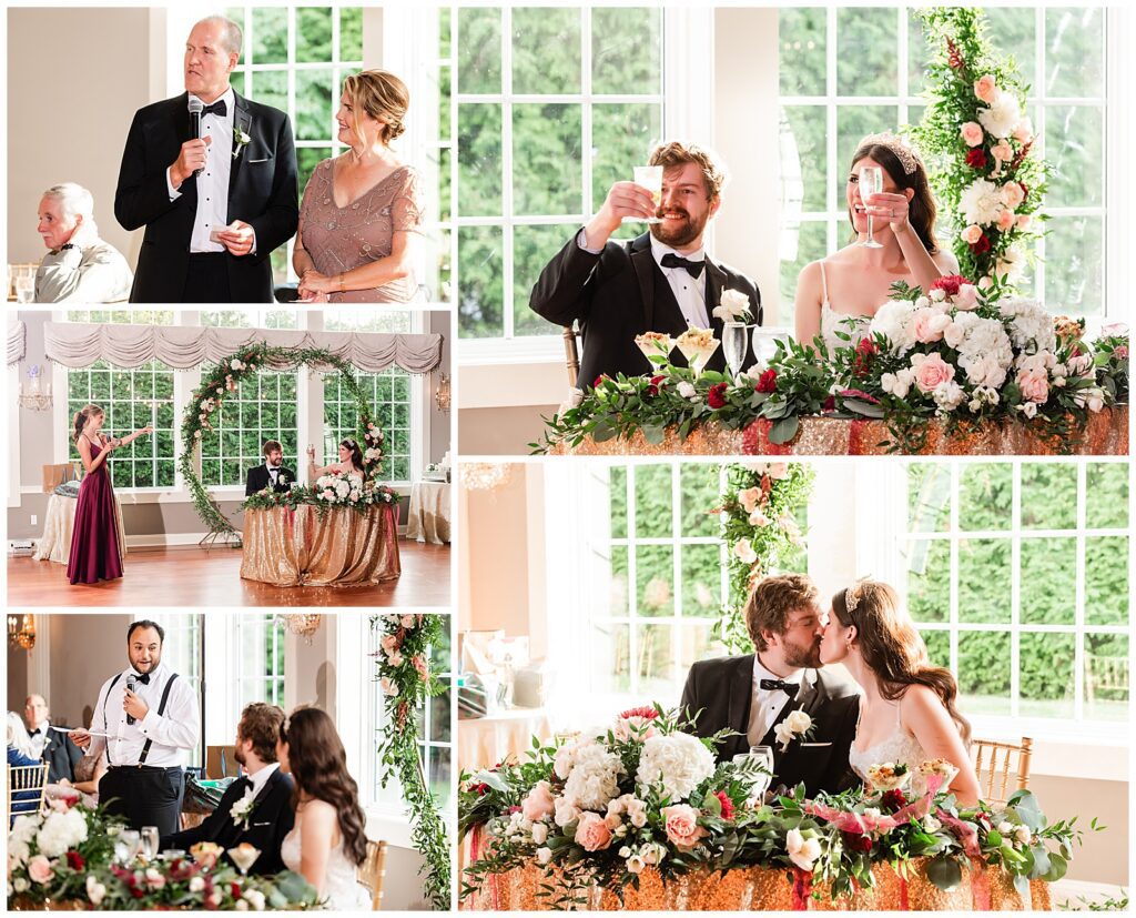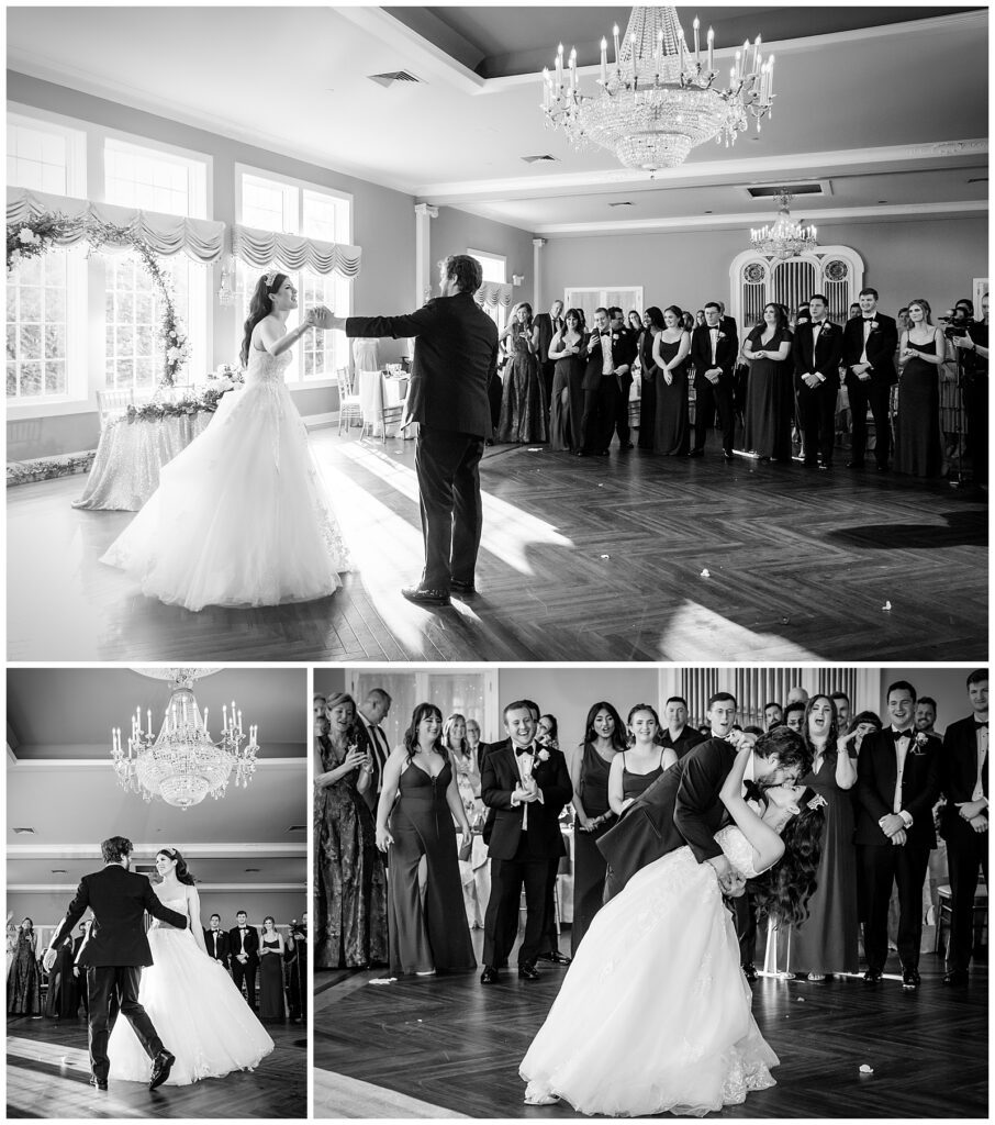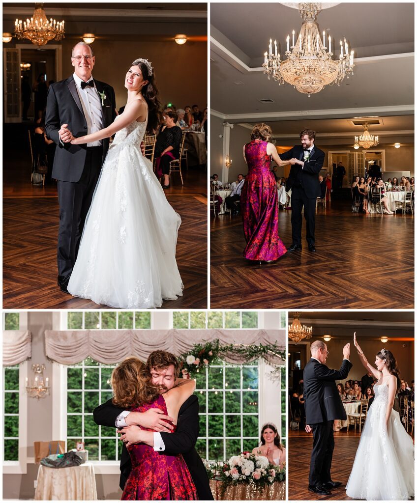 The baroque ballroom beautifully set with gold linen and centerpieces of white and red florals was ready for a wedding. Following the bustling bridal party, Olivia & Nicholas made their entrance into the ballroom and began their first dance. The newlyweds spun and dipped beneath the glamorous chandeliers to the tune of “Can’t Take My Eyes Off You”. The guests of honor settled at the sweetheart table and heard heartfelt words from many loved ones. Olivia shared a special song with her father then Nicholas with his mother.