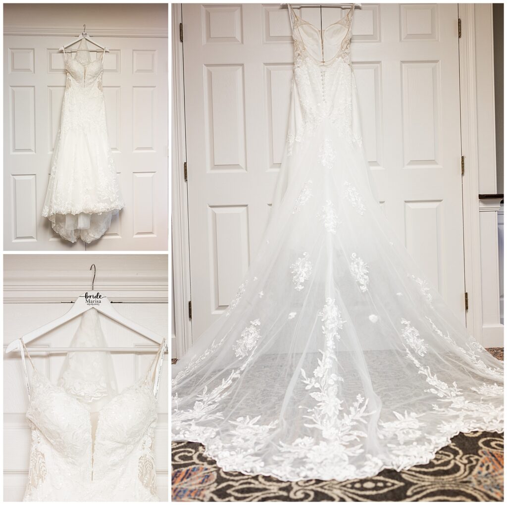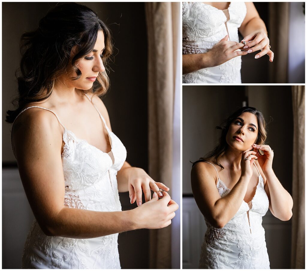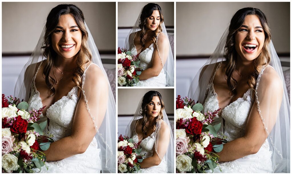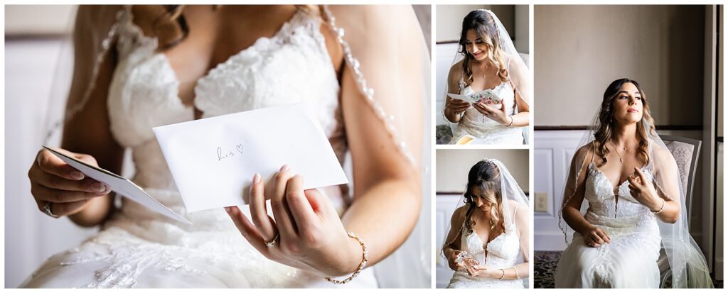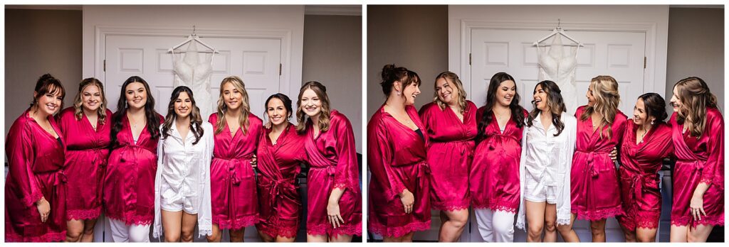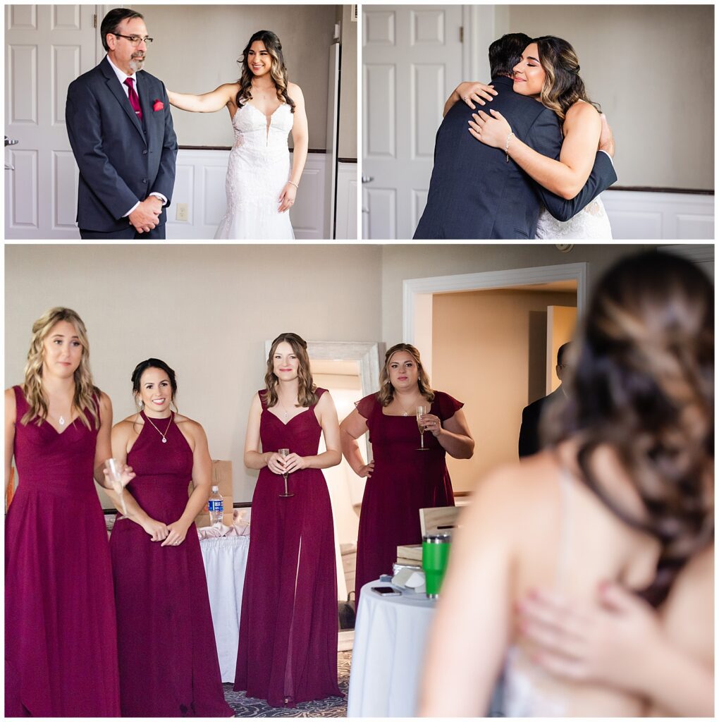 With plenty of room for the readying bridesmaids, Marisa & her bridal crew claimed the conference room while Sean prepared with his groomsmen back in their suite of The Desmond. After photographing Marisa’s sentimental and statement jewelry, we snapped a shot of the girls in their ruby red robes and got them into their gowns. Marisa’s mom was ready to go to work on those beautiful buttons with a crochet hook in hand. After adding her accessories, it was time for the unveiling of her bridal look. First, a first look with her dad, then her bridesmaids. We made sure to capture a few gorgeous bridal portraits before reading the card from her groom. Finally, the time had come for their first look in the garden before the wedding at The Desmond Hotel.