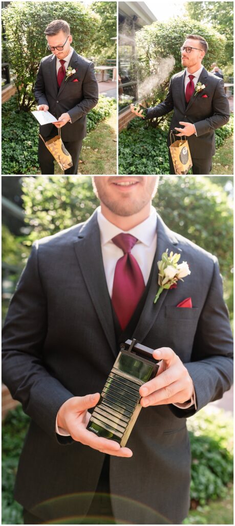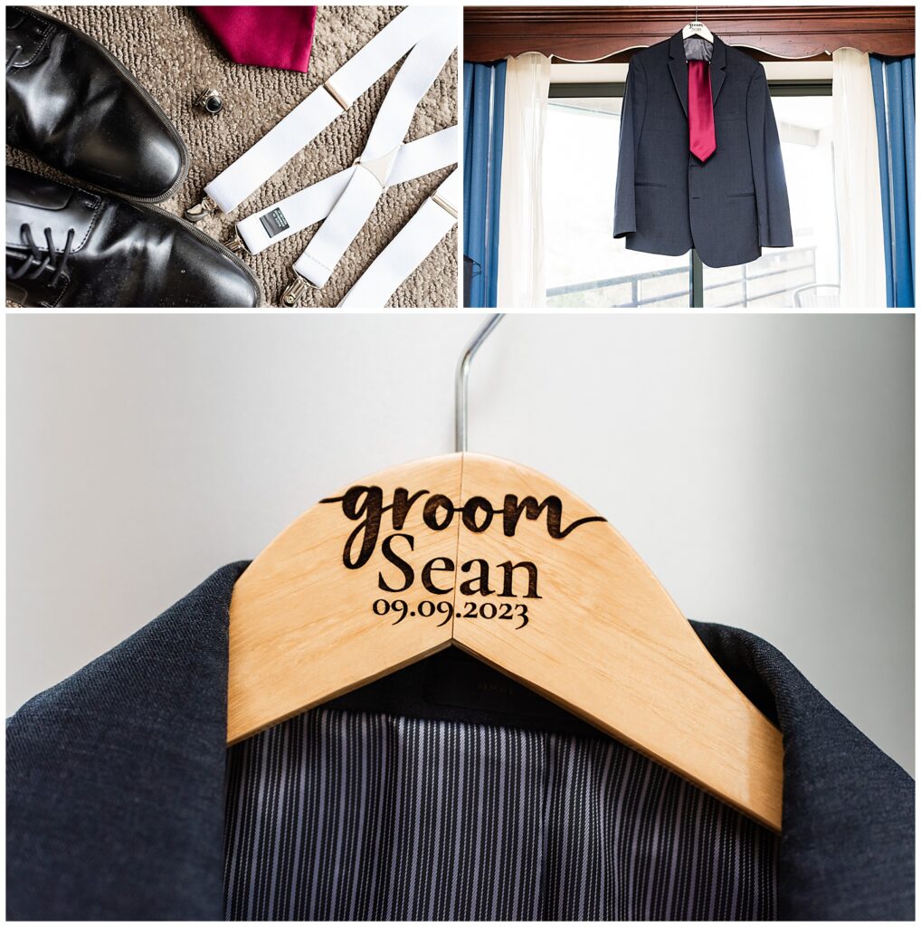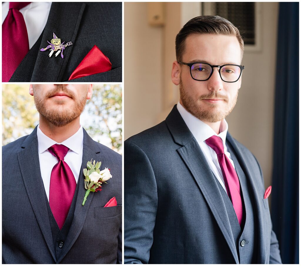Sean kept it classic with his three-piece charcoal suit and red tie to match the theme of the wedding at The Desmond Hotel. He came prepared with a plethora of pins for his lapel, our favorite featuring Spongebob, and a custom groom hanger featuring his wedding date. After stepping outside to open and spritz his gift, the anticipation began as he awaited his bride.