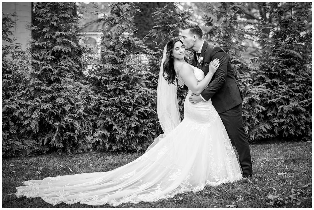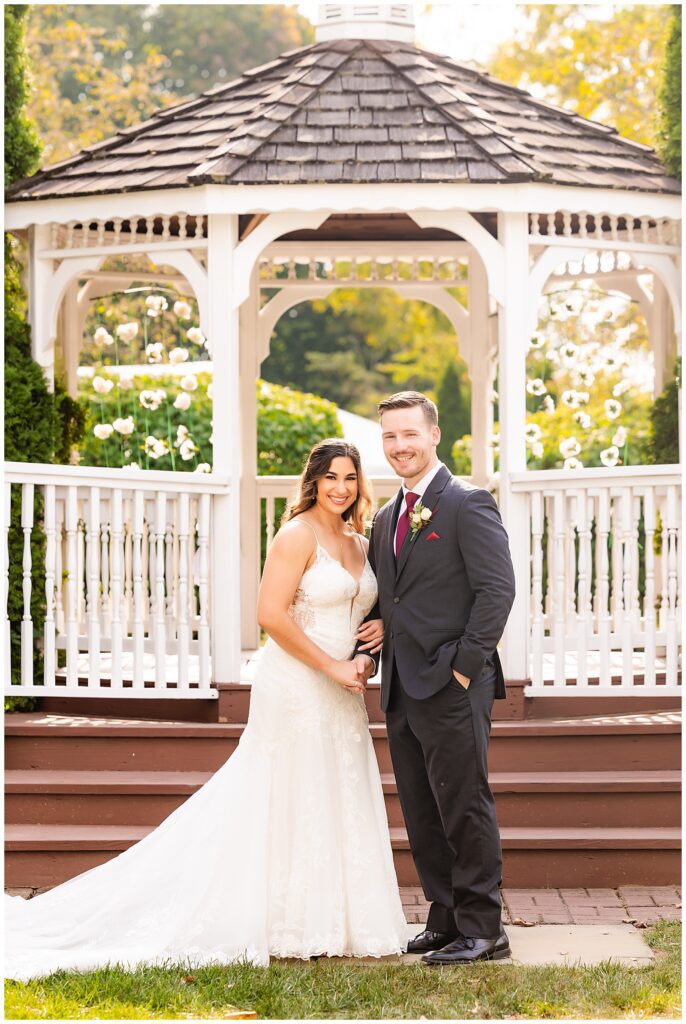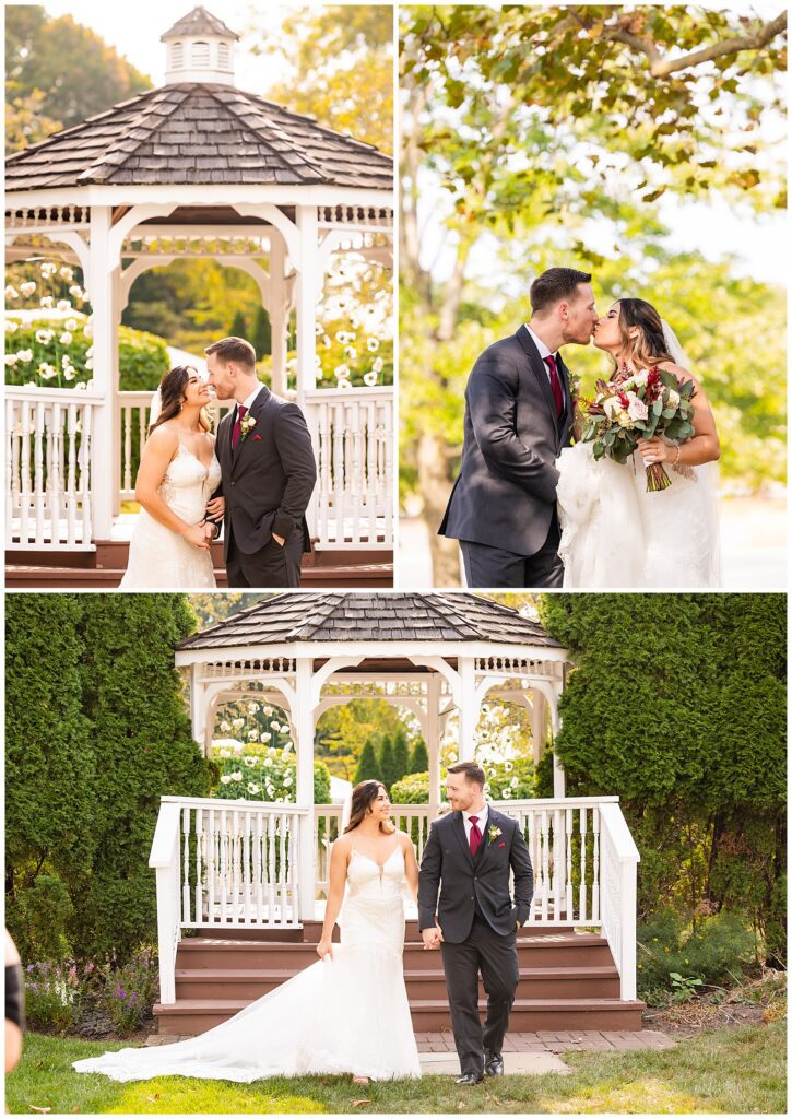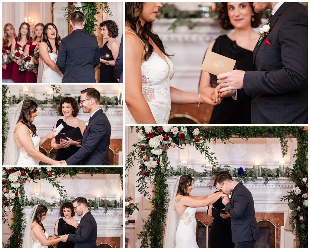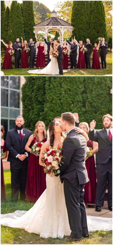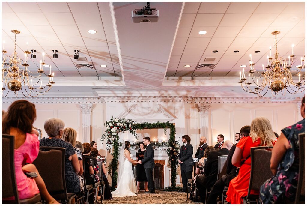 Whenever all of the wedding day festivities take place in one location, we love to look for some variety for your photos. The gazebo was the perfect place for their wedding party portraits. Strings of florals laced through the structure added the perfect touch as Marisa & Sean stood with their closest companions. The ruby red bridesmaids dresses and groomsmen ties contrasted beautifully with the greens of the surrounding garden. After bringing their families in for a few formals, it was time to get these two married with a wedding ceremony at the Desmond.
