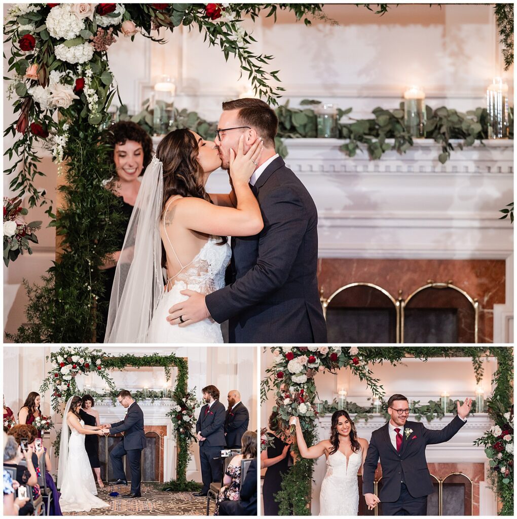To begin the ballroom wedding ceremony at The Desmond Hotel, Sean stood awaiting his bride under a fabulous floral arch. Both Marisa’s mother and father walked her down the aisle and kissed her on the cheek before handing her off to Sean. His personal vows would draw out one of Marisa’s signature smiles that he loves so much. Before placing the rings on each other’s fingers, he took her hands and kissed them as they excitedly became husband and wife. The ceremony concluded with their first kiss and traditional smashing of the glass and headed up the aisle & into forever!