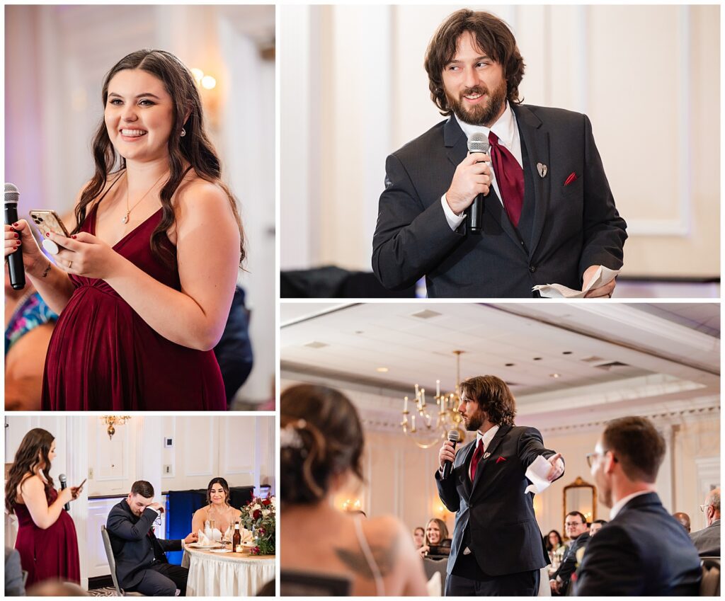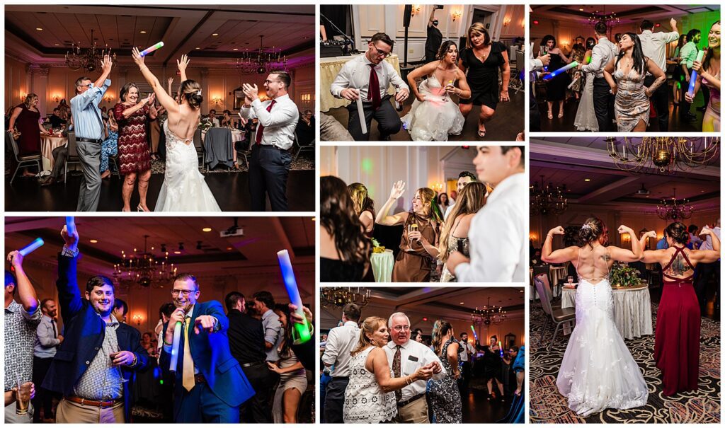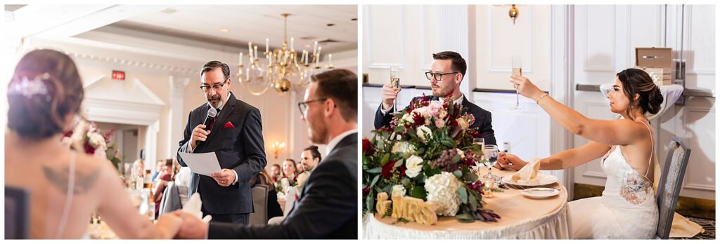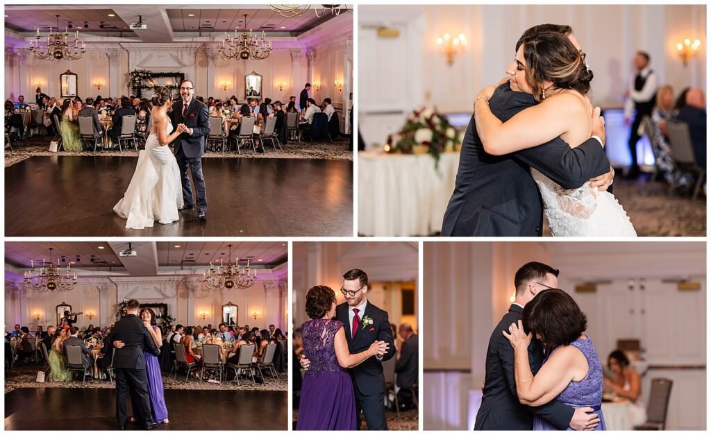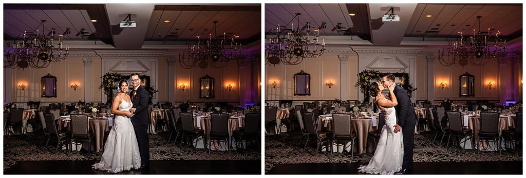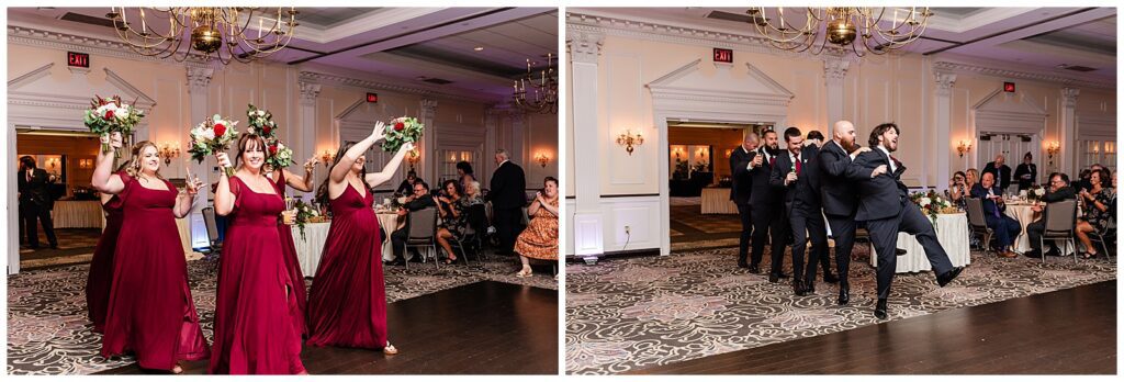 While guests were enjoying their final moments of cocktail hour, the bride and groom snuck off to the ballroom for a room reveal of their wedding reception at the Desmond Hotel. They even had a moment to practice their first dance in the empty ballroom before the wedding party made their entertaining entrances.