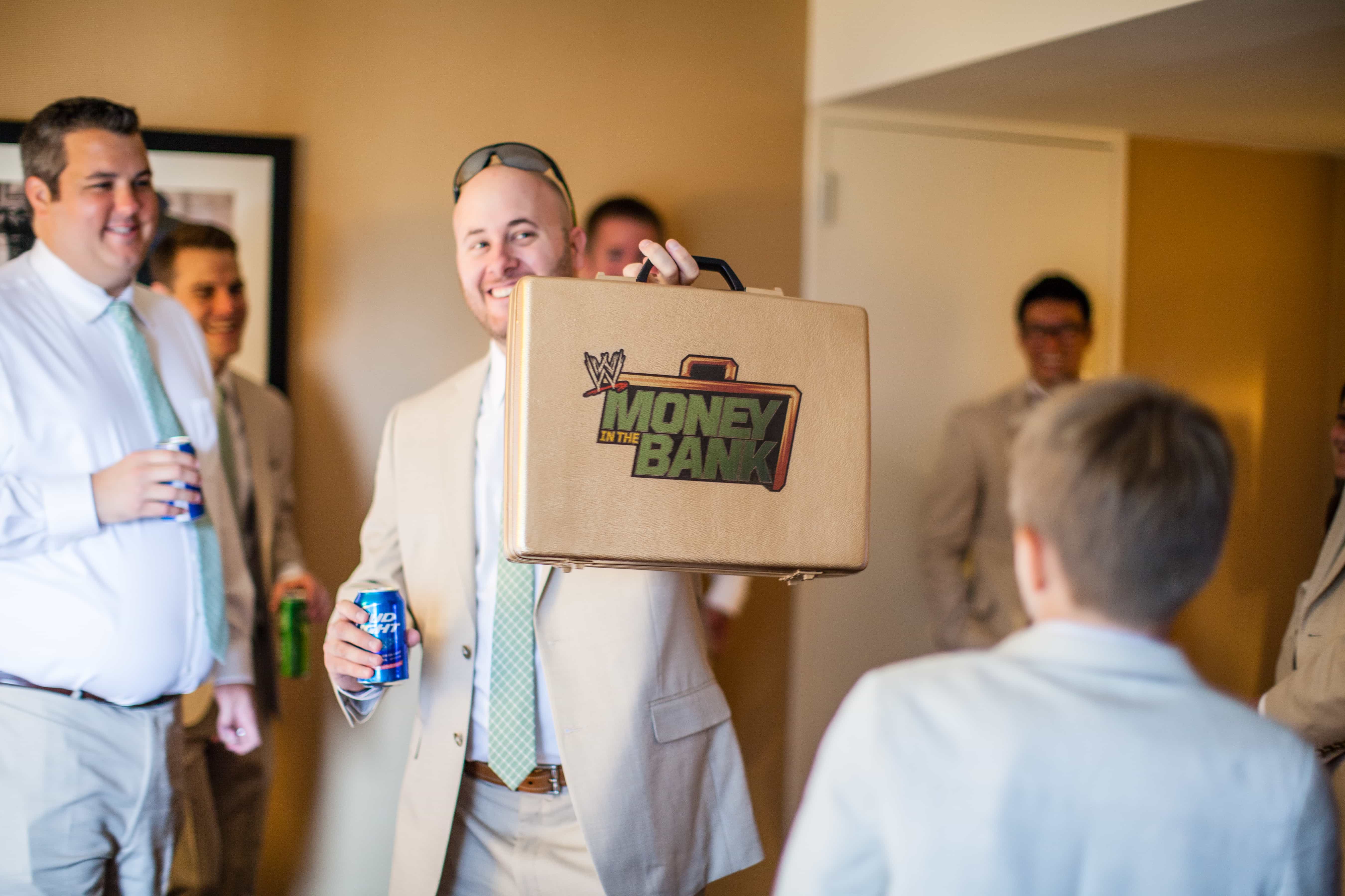 Are you ready to rrrruuuuuummmmmmbbbbllllleeeeee??? Deanna and Tim got married in late August and they didn’t do anything halfway. 14 groomsmen and 7 bridesmaids, wrestling champ belts, a handmade “Money in the Bank” suitcase full of gifts, all the attention to hair and makeup, right up to the boisterous bride and groom themselves – this wedding was off the charts.