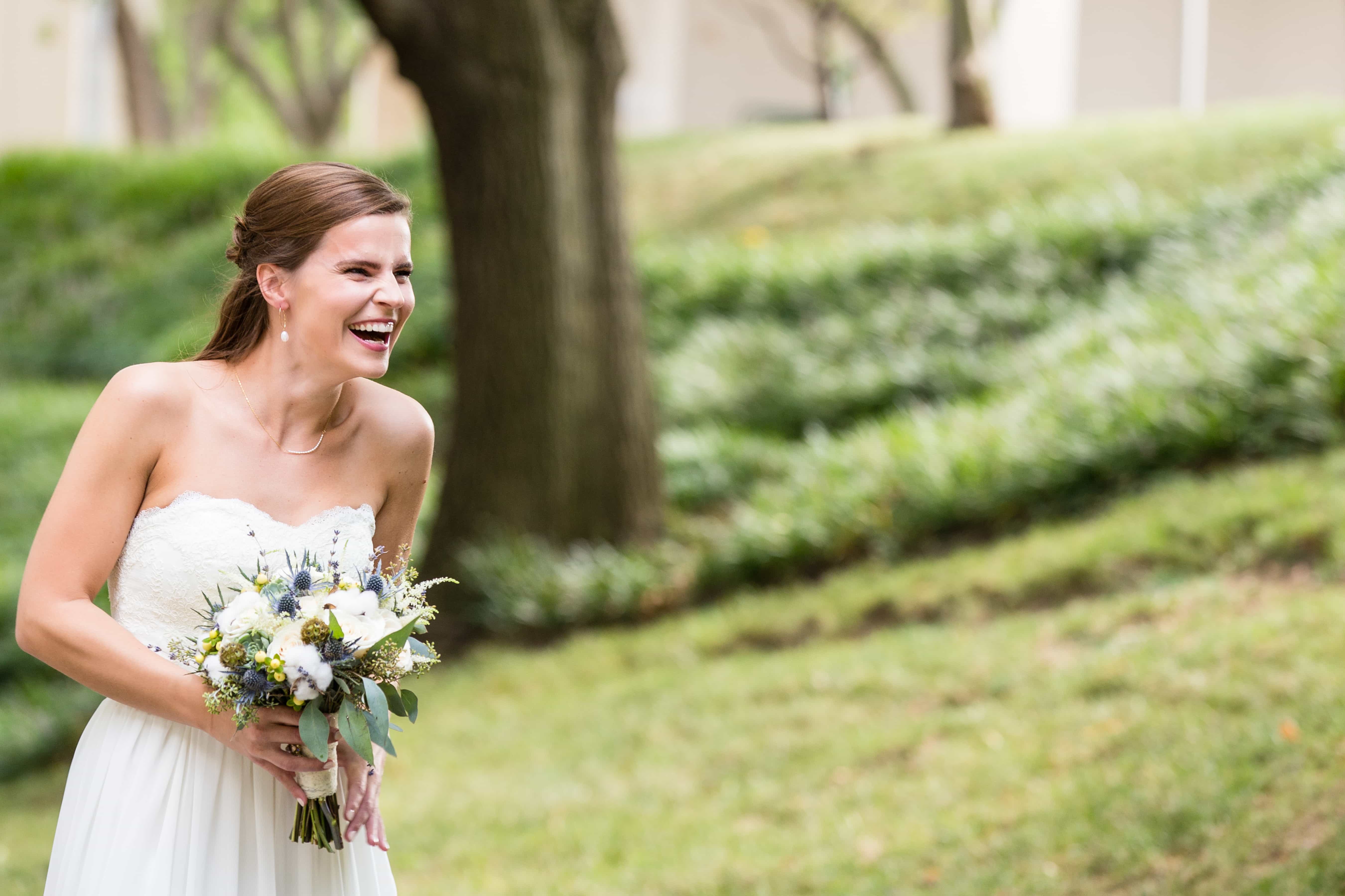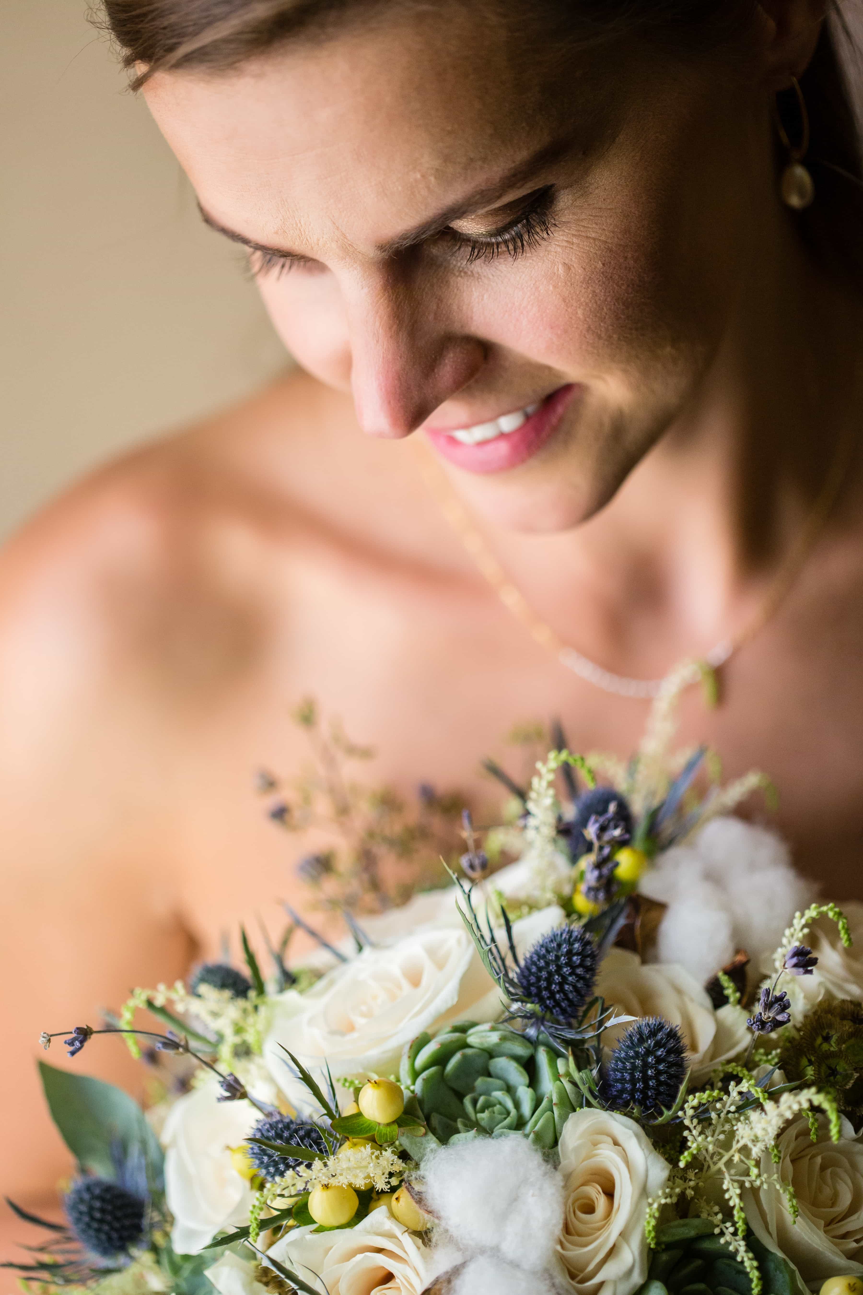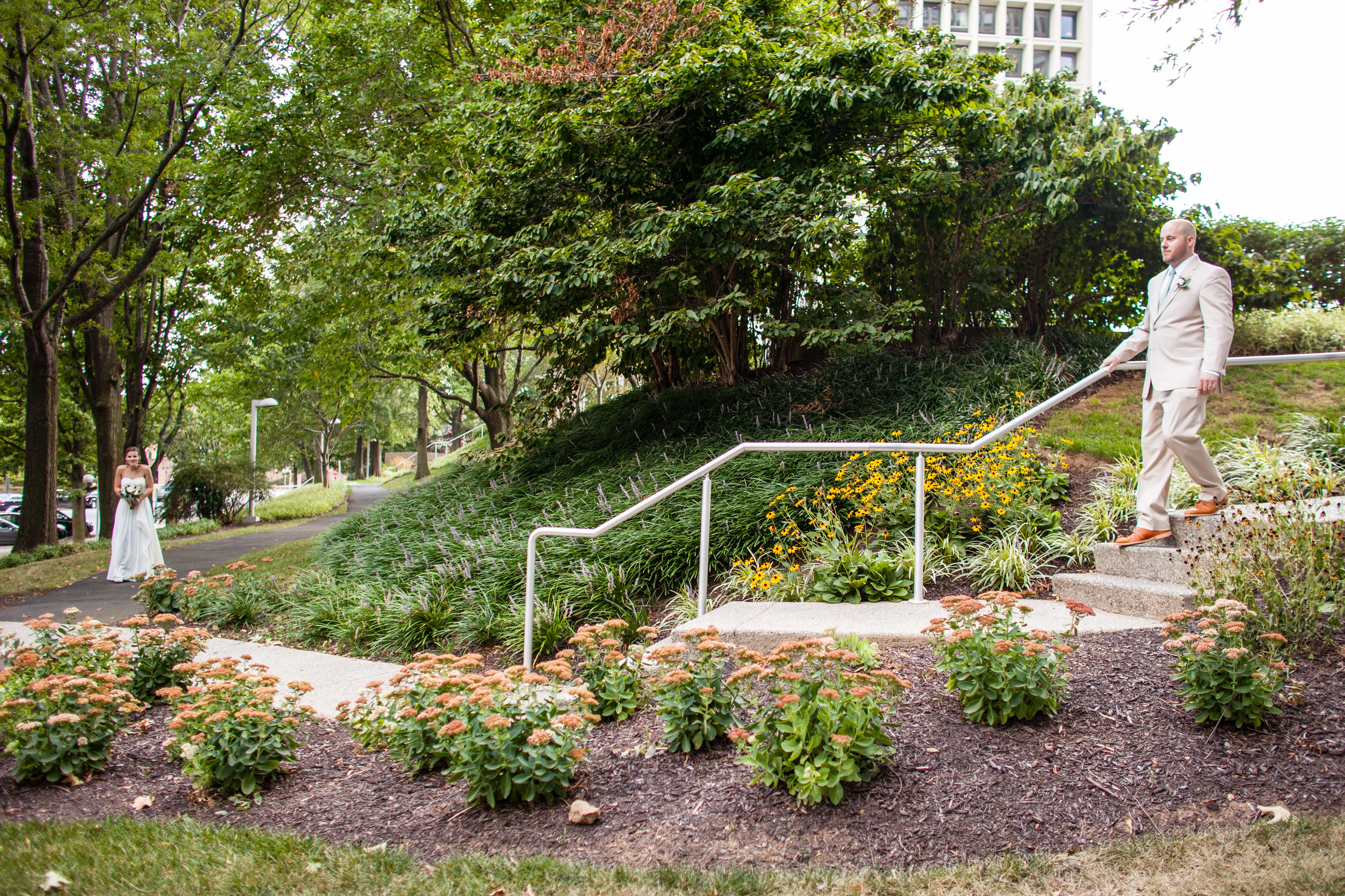 We orchestrated the first look at the top of a picturesque staircase where Tim waited for his lovely bride to be. Deanna excitedly moved into her position, and before we even gave her the go ahead she started walking towards her groom. After a brief pause at our behest, these two loves made a beeline for each other and shared a long embrace followed by tender kisses. These moments never become rote to us, each one is so unique, as unique as the two individuals and their love.